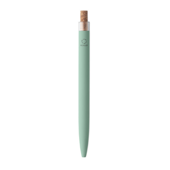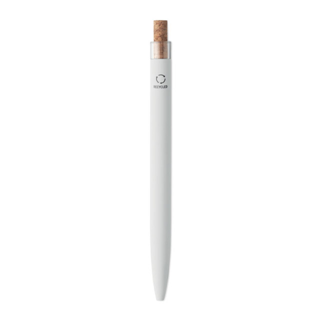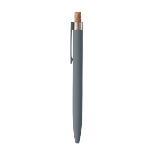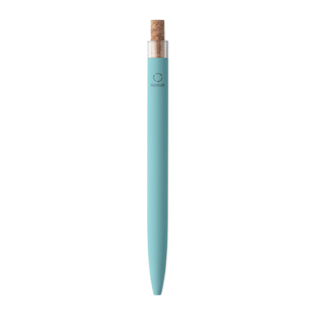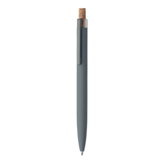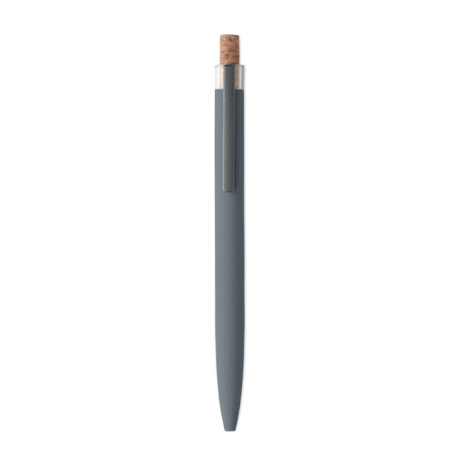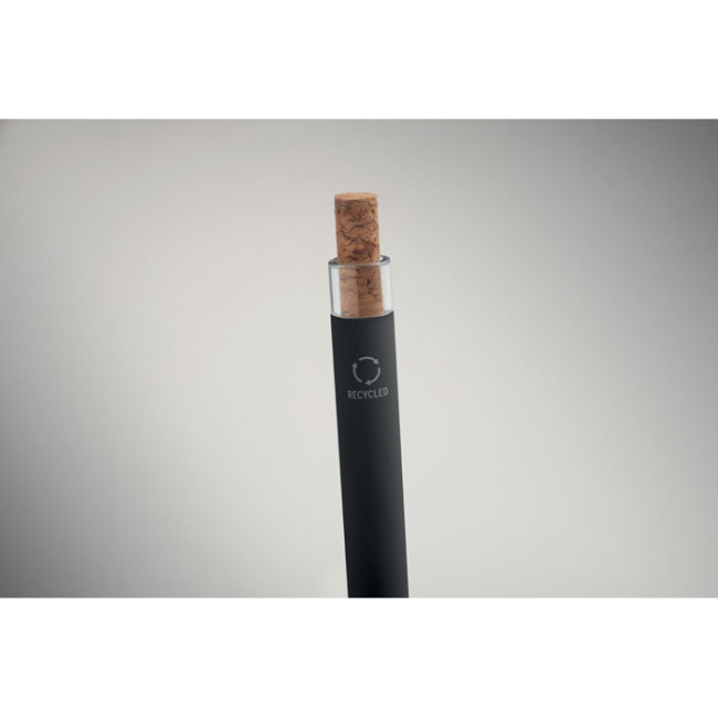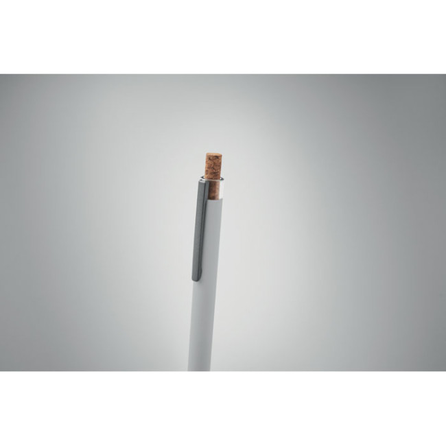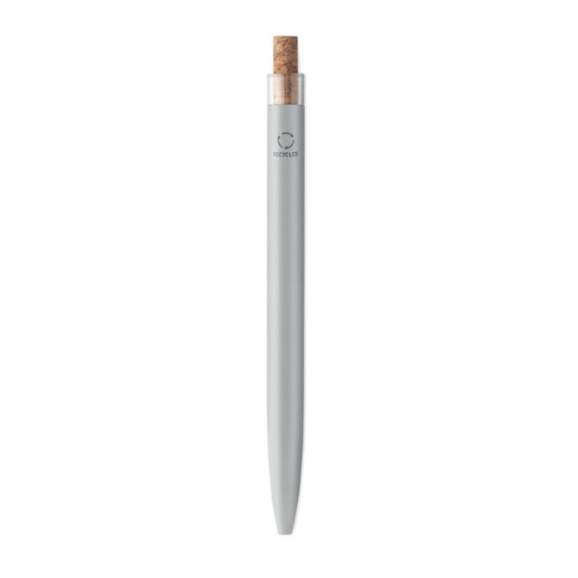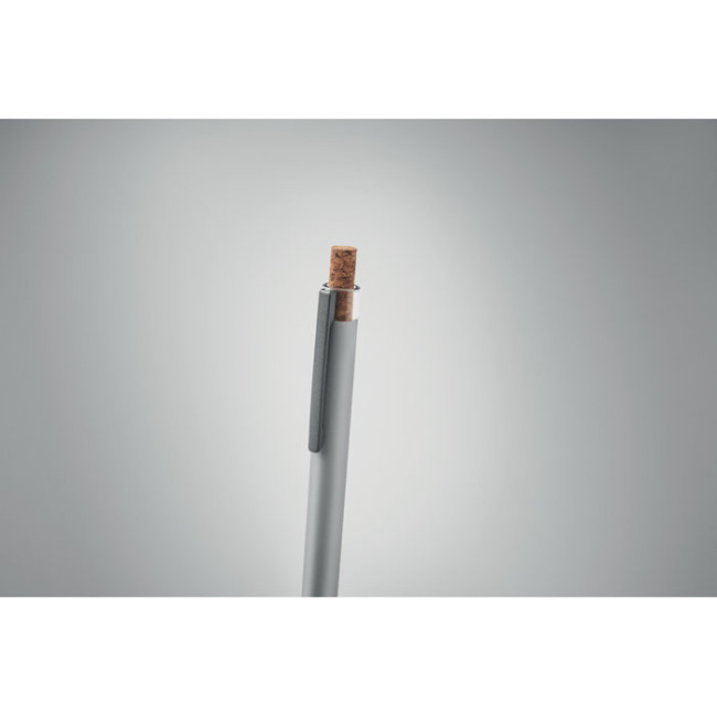 Penna a sfera in alluminio riciclato con pulsante in sughero e clip in metallo. Inchiostro blu.