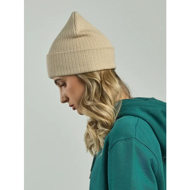 Berretta in acrilico a doppio strato, realizzata in 100% poliestere riciclato certificato. Include un'etichetta removibile, permettendo una facile personalizzazione. La composizione è in fase di aggiornamento per ridurre l'impatto ambientale.