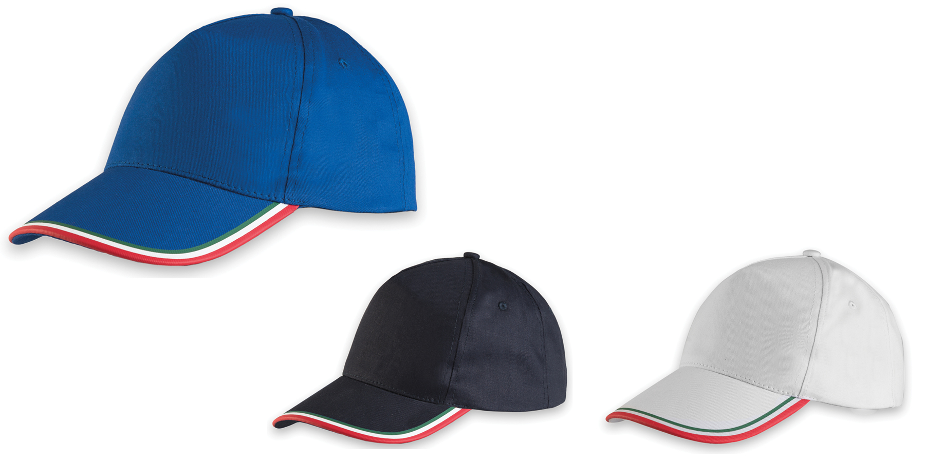 Berretto a 5 pannelli con visiera rigida, dotato di chiusura in velcro regolabile in colore abbinato. Presenta un tricolore stampato sulla visiera e si adatta a taglia unica, ideale per diverse occasioni.