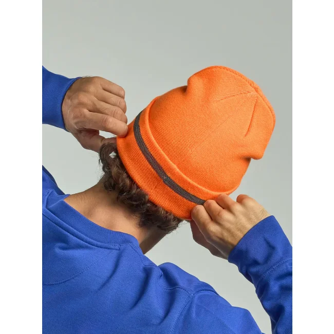 Berretto ad alta visibilità realizzato in poliestere riciclato, dotato di striscia riflettente per una maggiore sicurezza. Il tessuto a doppio strato e la finitura piatta garantiscono comfort e praticità. Etichetta removibile per personalizzazioni senza compromessi.