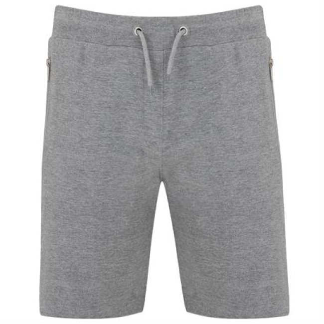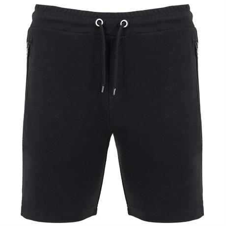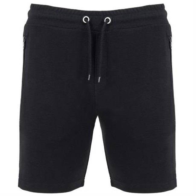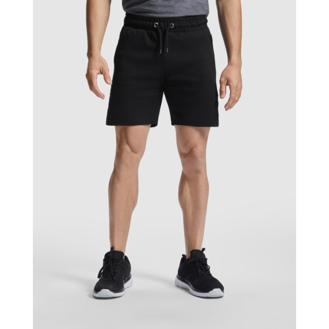 Pantaloncini con girovita elastico e cordoncini con occhielli metallici. Due tasche laterali con cerniera invertita in tinta e tiretto. Fascia laterale in tinta. Ornamento della patta cucita. Tasca posteriore con bottoni a pressione.