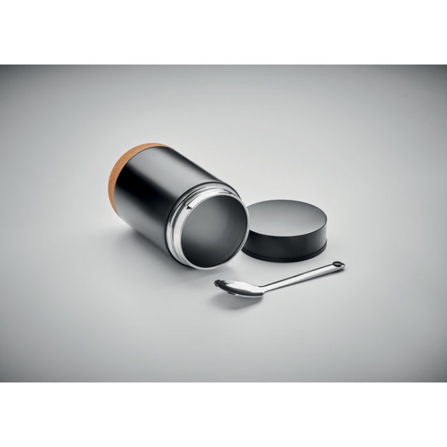 Barattolo isolato a doppio strato in acciaio inox con tappo a vite e base in sughero. Include cucchiaio. Capacità: 400 ml.