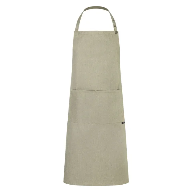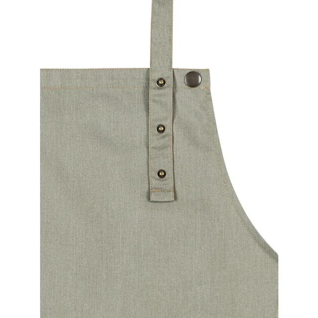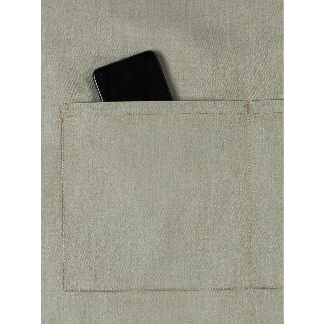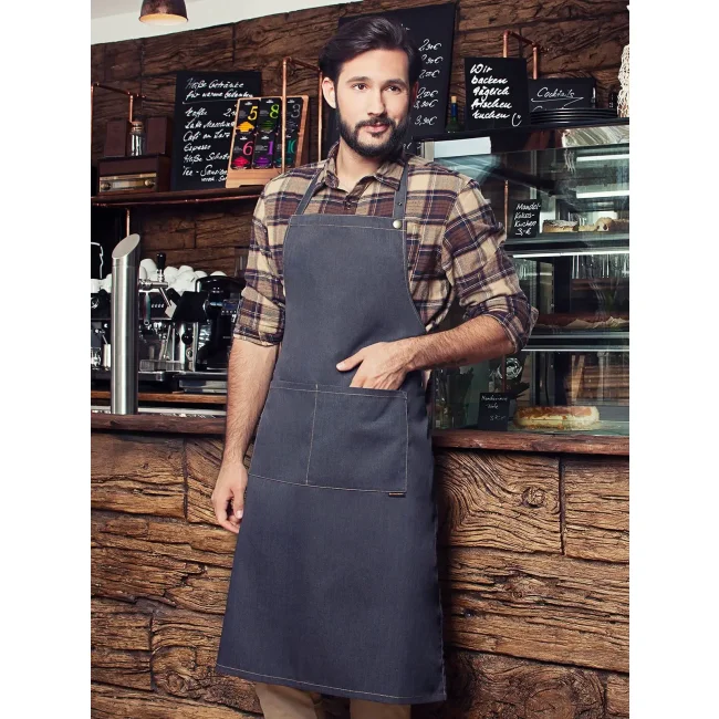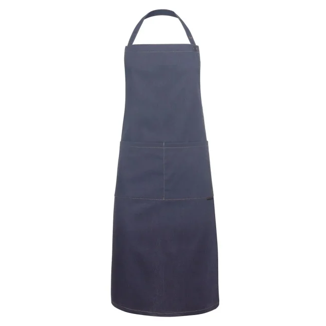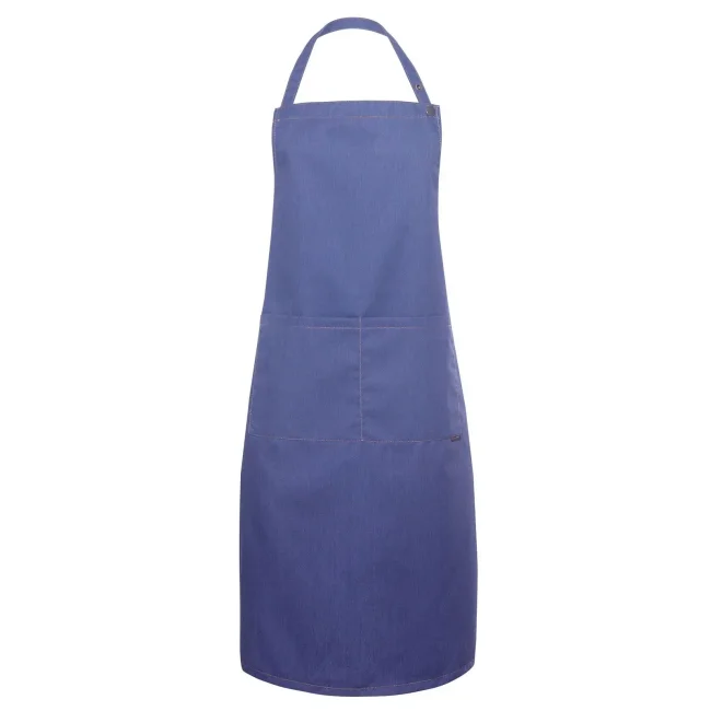 65% poliestere, 35% cotone. Grembiule di jeans con pettorina, doppie cuciture, cuciture in contrasto, cordino al collo regolabile con tre bottoni, tasca frontale (40 x 20 cm) con due comodi compartimenti (20 x 20 cm). Adatto al lavaggio industriale. Cordini in vita 112 cm l'uno.