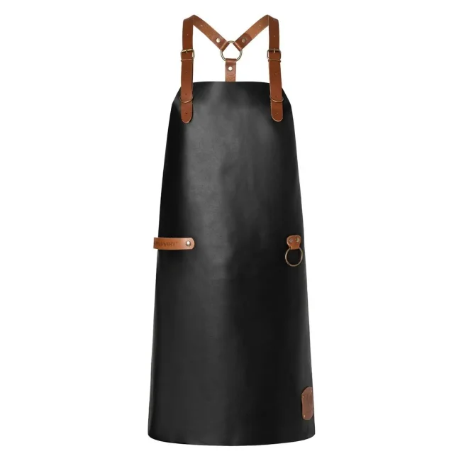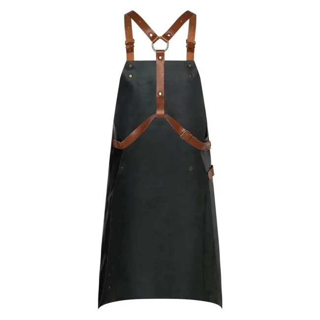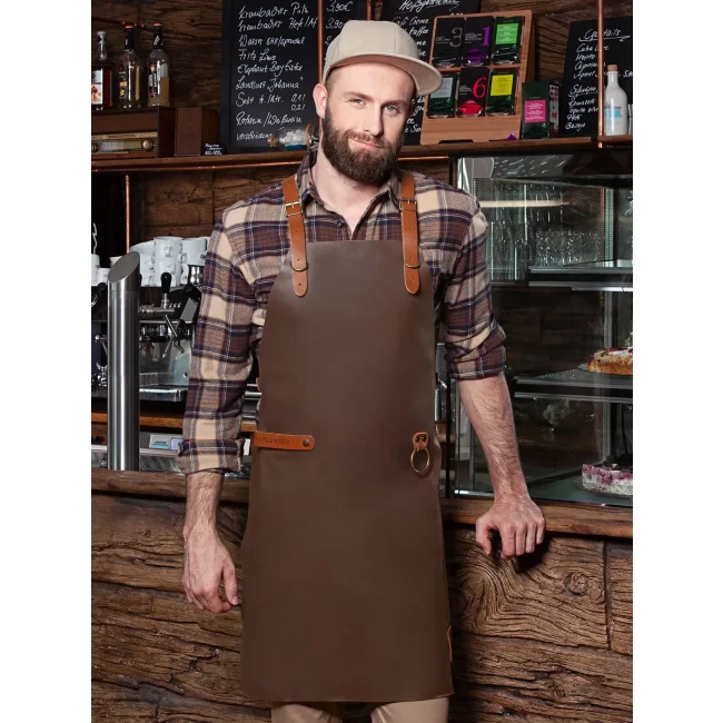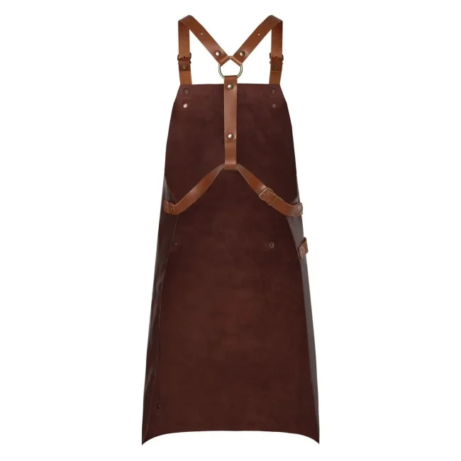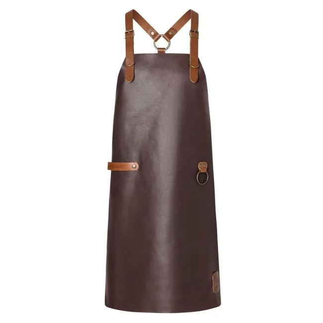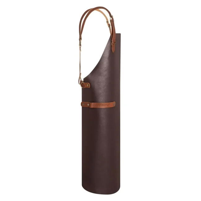 100% pelle di bue. Grembiule con pettorina con applicazioni in pelle di diverso colore e borchie di metallo color bronzo, lacci della pettorina facilmente regolabili con fori, bretelle incrociate funzionali per alleggerire la zona cervicale, cinturino in zona del bacino regolabile con fori per una tenuta ottimale. Il laccio in pelle color cognac sul lato anteriore destro, il pratico anello di metallo sul lato anteriore sinistro. Non lavare. Misure: 60 x 82 cm.