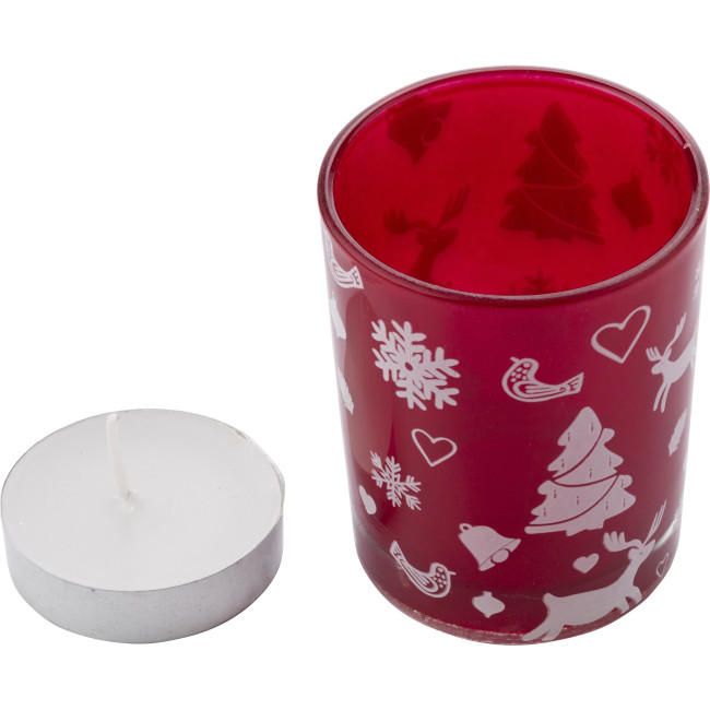 Bicchiere portacandela con decorazione natalizia: si presenta avvolto in carta regalo trasparente e nastro rosso