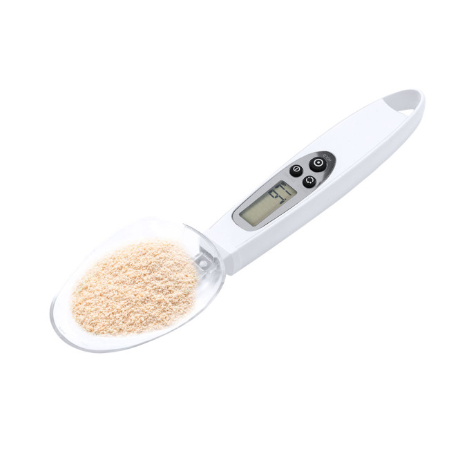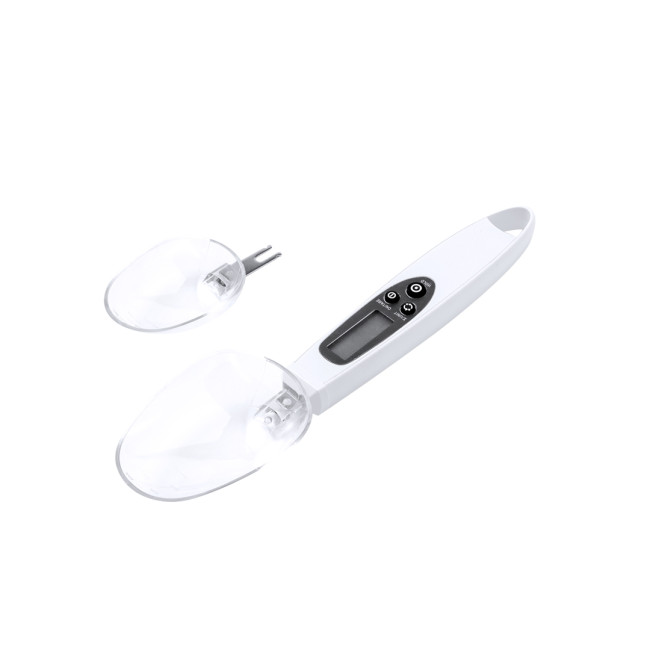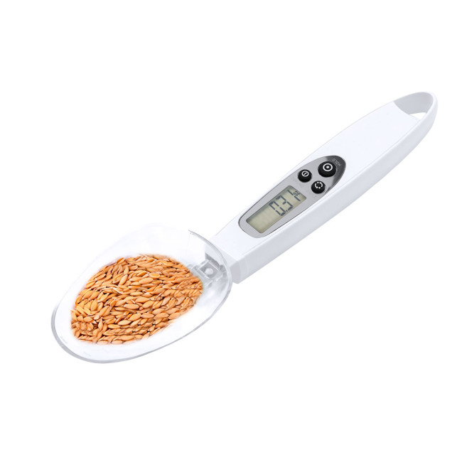 Bilancia digitale portatile progettata per pesare liquidi e solidi. Include due cucchiai intercambiabili e uno schermo LCD per una lettura precisa. La bilancia ha una capacità di pesatura fino a 5 kg e un'ulteriore scala di misurazione sui cucchiai. Alimentata da batteria a bottone, è presentata in una scatola dal design kraft.
