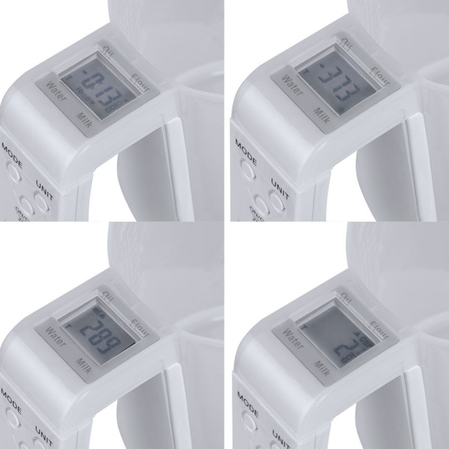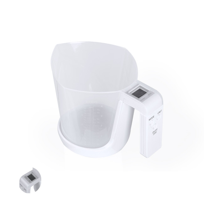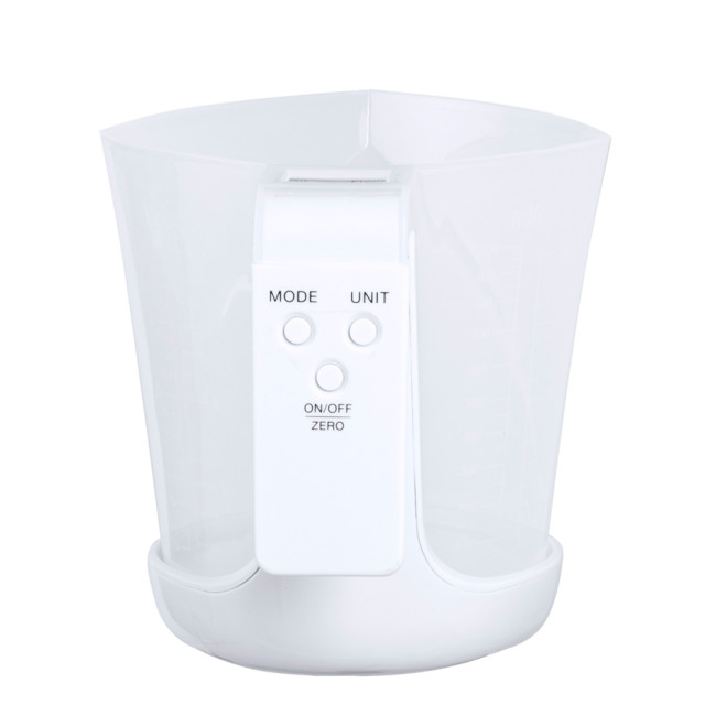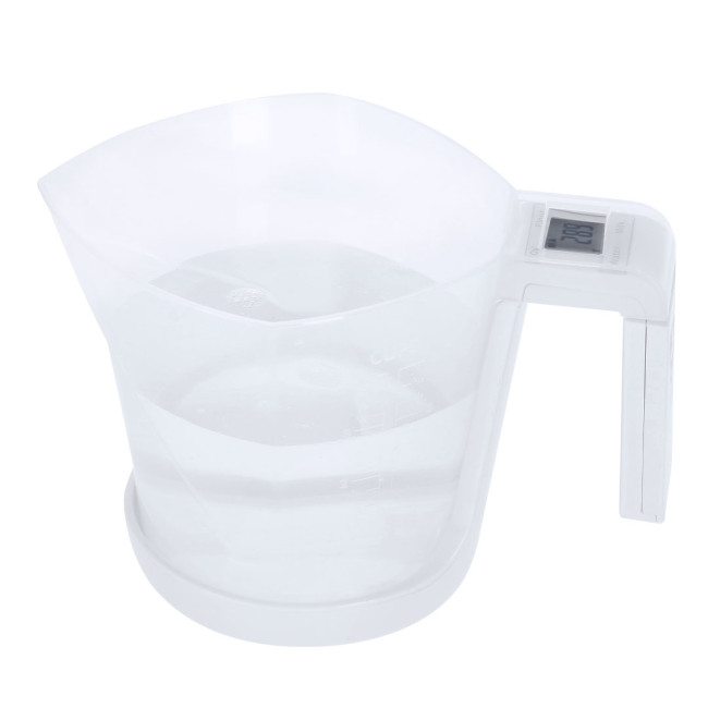 Bilancia con misurino integrato realizzata in PP e ABS, con schermo LCD e funzione tara. Include una caraffa graduata da 1 litro con contatore laterale. La bilancia ha una capacità massima di 5 kg e funziona con batteria a bottone, presentata singolarmente.