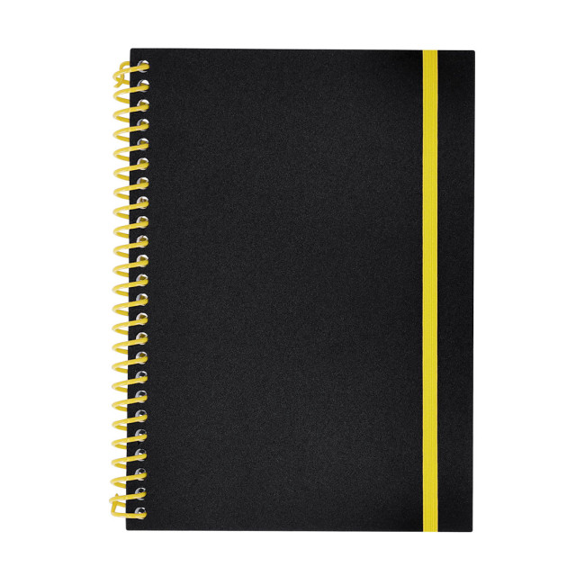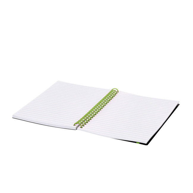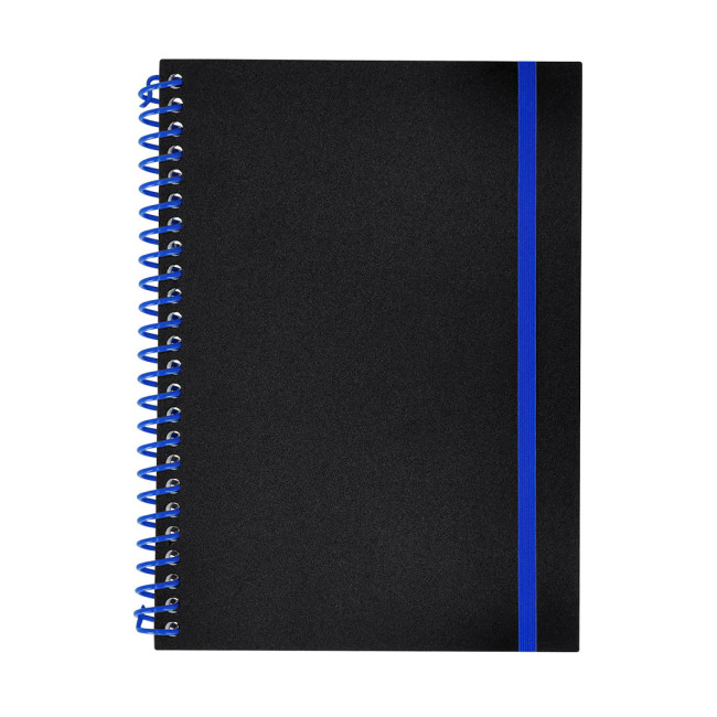 Quaderno ad anello con copertine flessibili in PP. Interno con 80 fogli bianchi disposti a una sola riga. Include elastico abbinato con anelli.