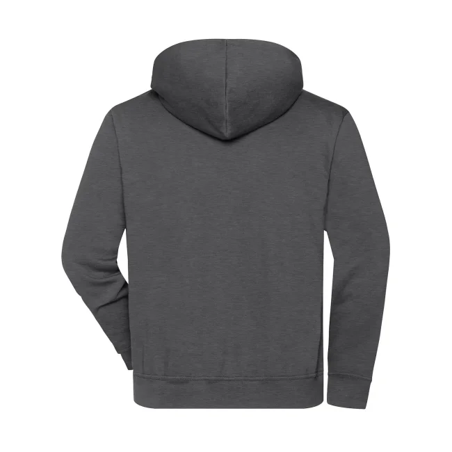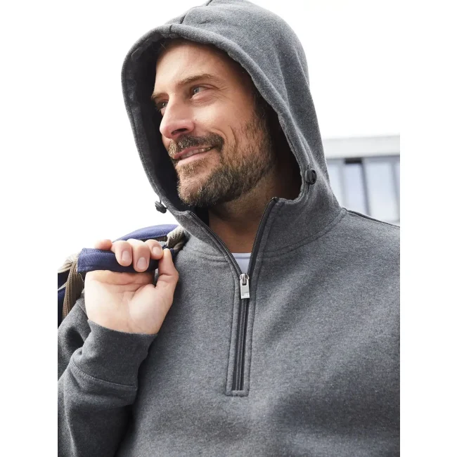 70% cotone organico, 30% poliestere. Felpa easy care con cappuccio e mezza zip, tessuto robusto, felpata internamente, cappuccio a doppio strato con cordino elastico e regolabile, polsini e orlo a costine con elastan, zip YKK.