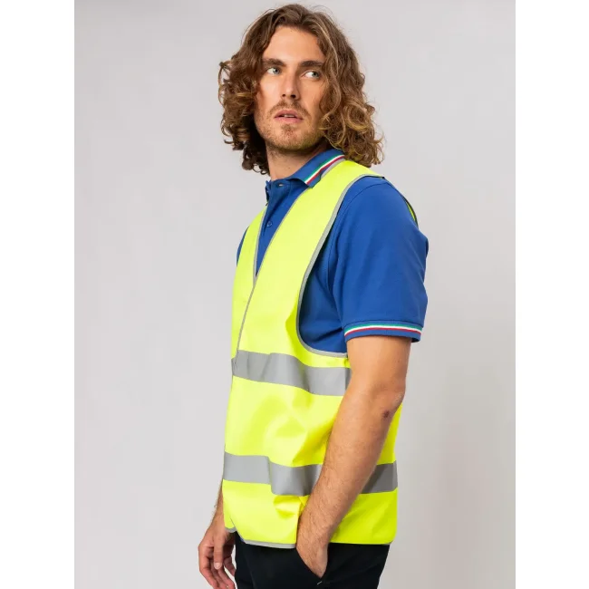 100% poliestere. Gilet alta visibilità. Cuciture di 50mm sulle fasce riflettenti. Chiusura frontale in Velcro. Da indossare attillato per la massima efficienza. Adatto alla stampa transfert, stampa diretta o ricamo. EN ISO 20471:2013, class 2, conforme a direttiva 89/686/EEC. Etichetta strappabile.