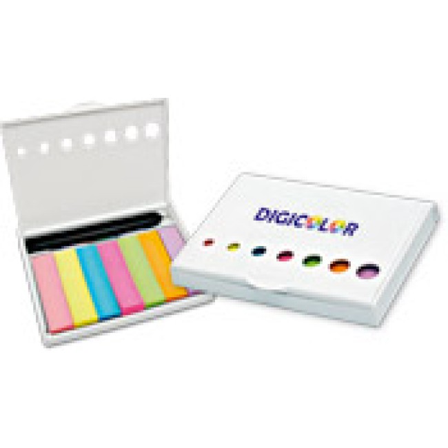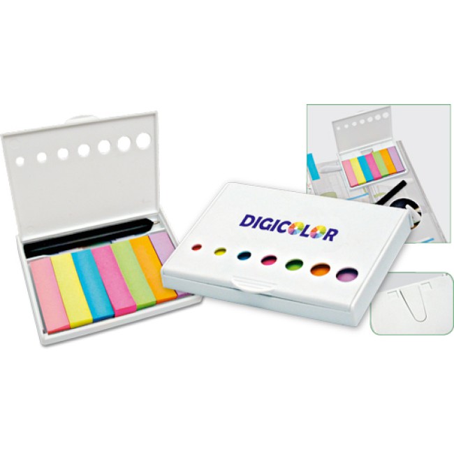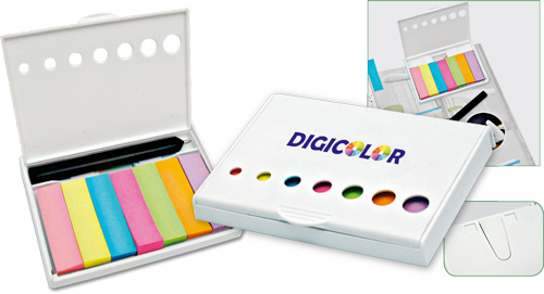 Blocchetto adesivo, contenitore in plastica, con penna.