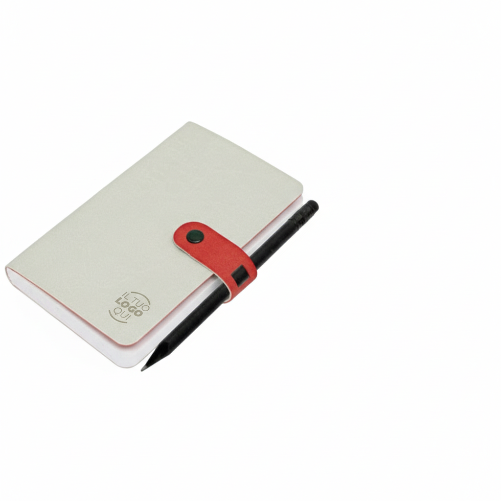 Blocco Reflexa neutro con passante portapenne, composto da 224 pagine in vivella bicolore. Include una matita e un astuccio di confezione, rendendolo un'ottima scelta per appunti. Personalizzabile con logo.