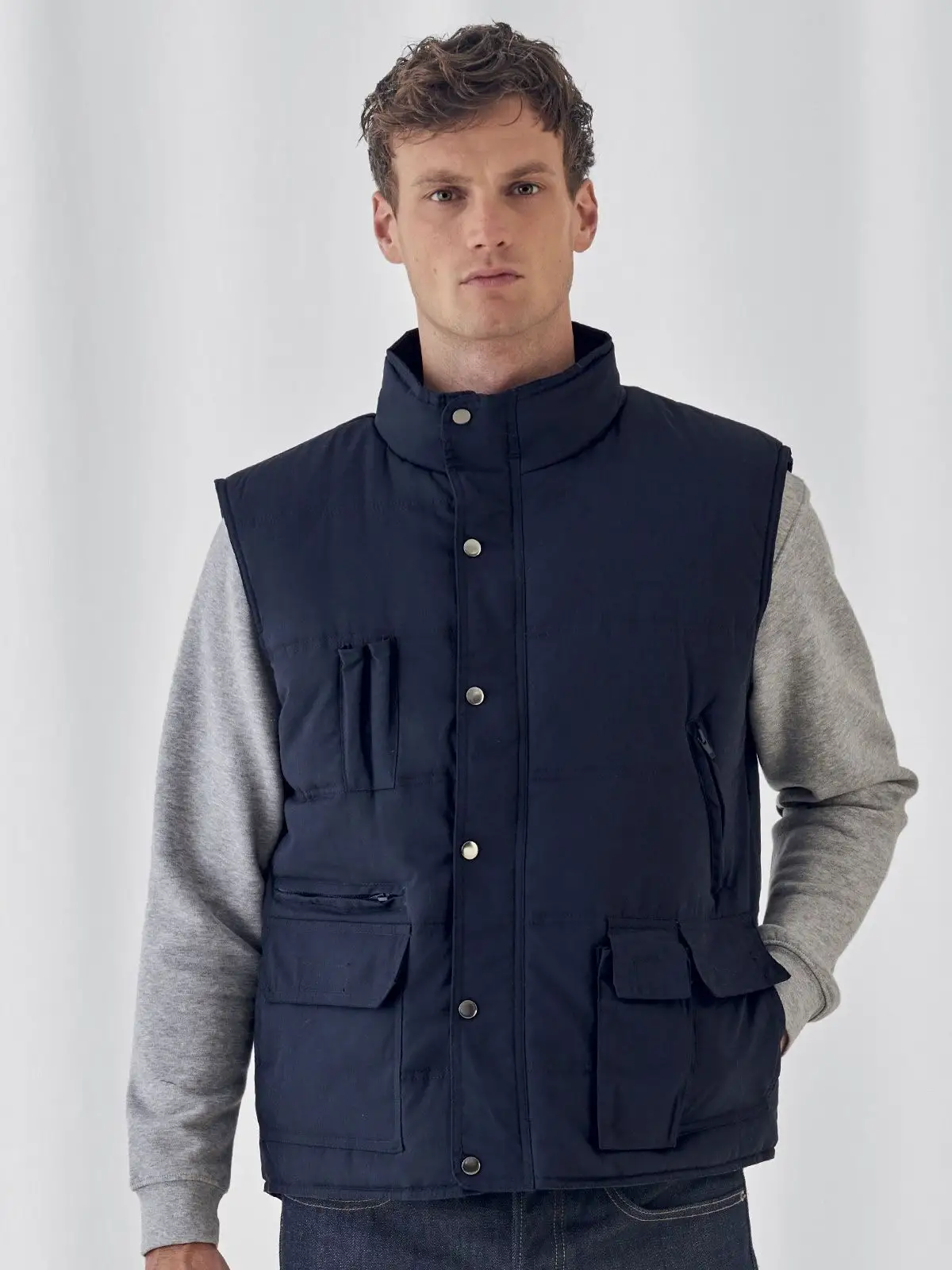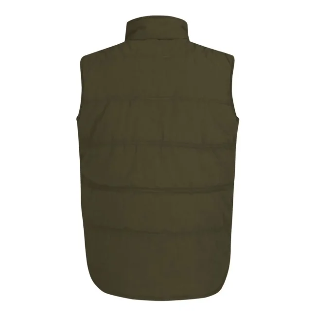 65% poliestere, 35% cotone. Giacca smanicata leggera, antivento e idrorepellente, 5 tasche esterne, 2 con zip, taschino interno, coulisse regolabile nell'orlo inferiore e nel giromanica, parte posteriore leggermente più lunga.