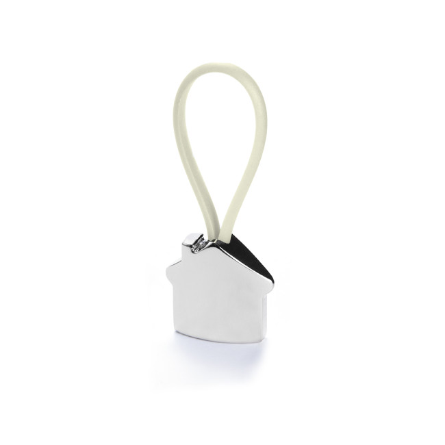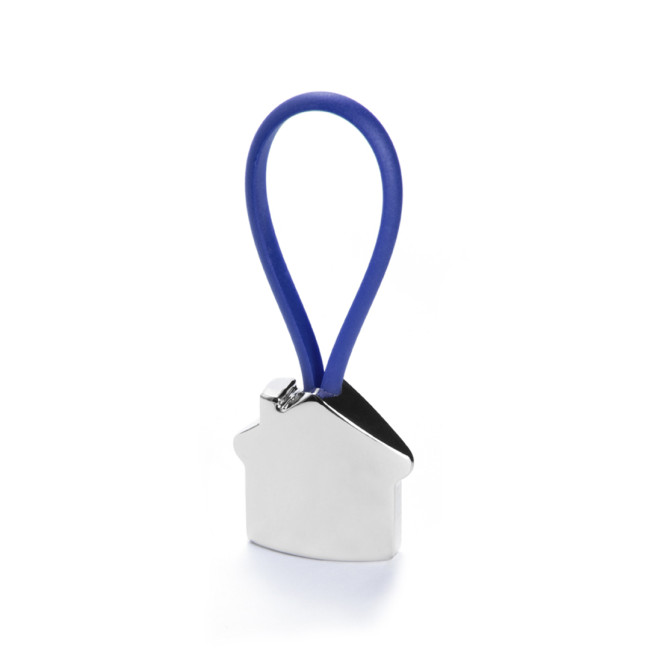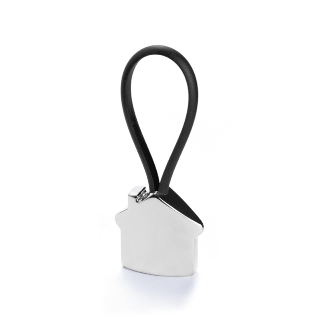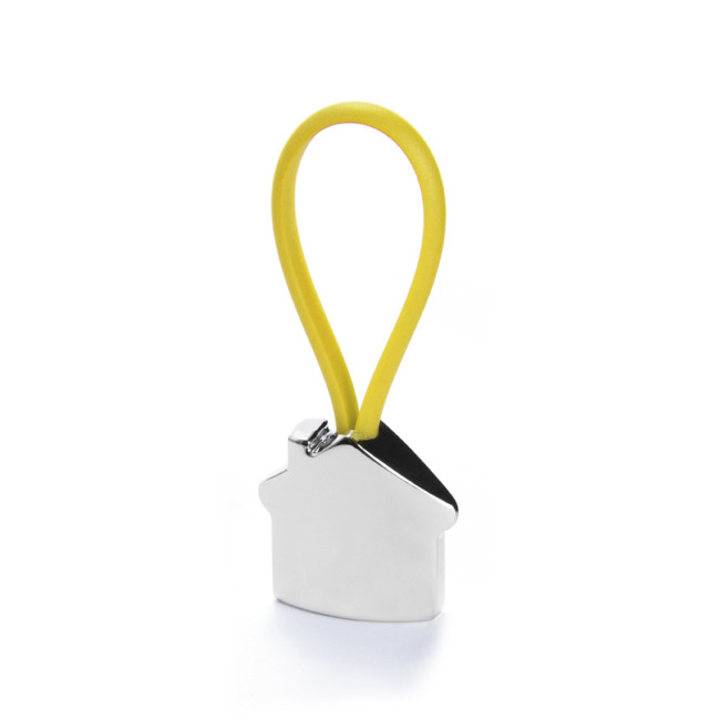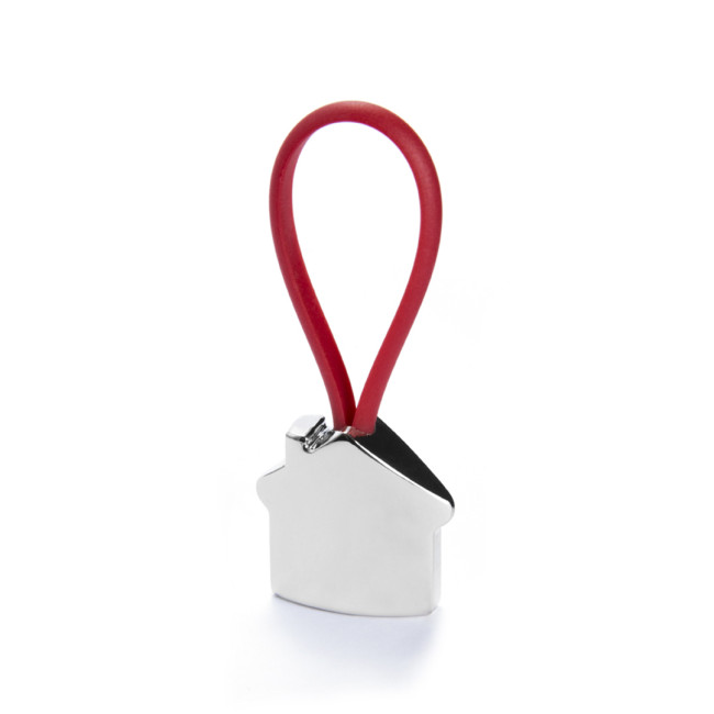 Portachiavi in metallo con un divertente disegno 3D di una casa. Con cinta elastica e disponibile in vari colori vivaci.