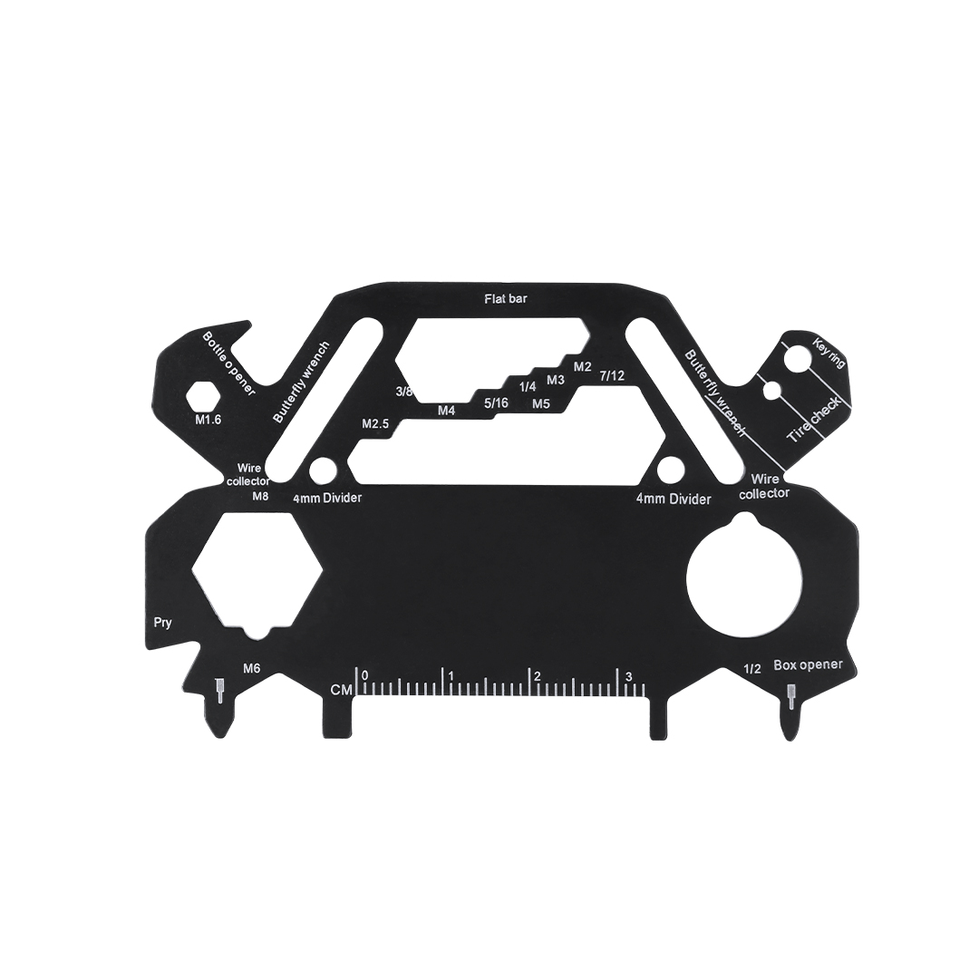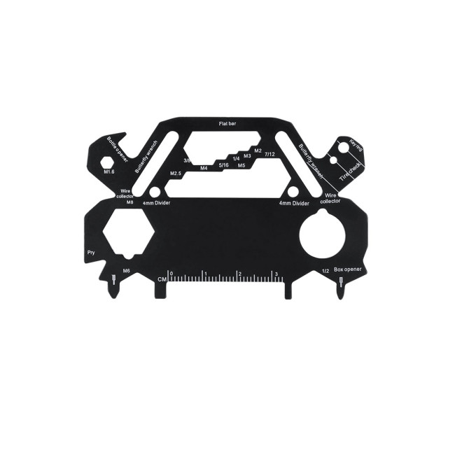 Originale e pratica multiutensile in acciaio inox a forma di auto. Con 30 funzioni, tra cui: cacciavite a punta piatta e a stella, chiave per dadi esagonali in diverse dimensioni, righello e apribottiglie.