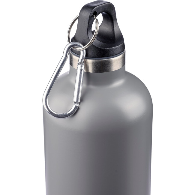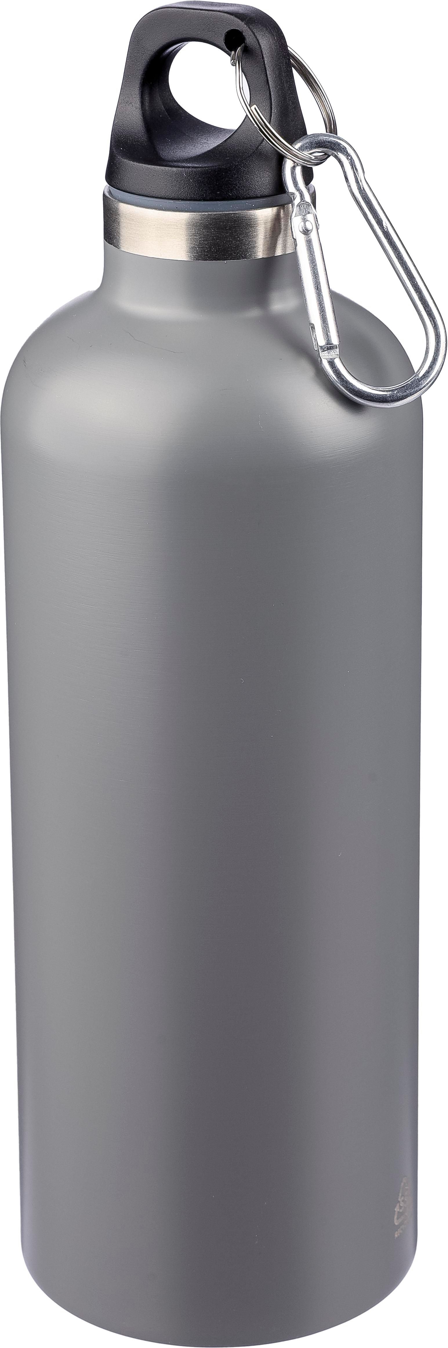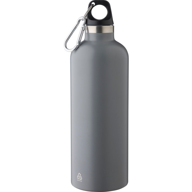 Borraccia a doppia parete in acciaio inox 304 riciclato, coperchio in PP e moschettone in alluminio. Mantiene le bevande calde per 8 ore e fredde per 12 ore. La borraccia presenta una finitura opaca (tranne per l’argento) e include un logo laser riciclato. Confezionata singolarmente in una scatola in cartone avana, capacità 500 ml