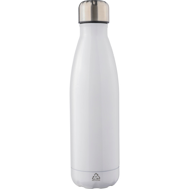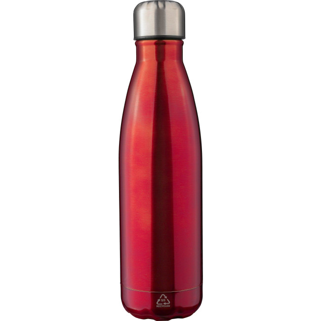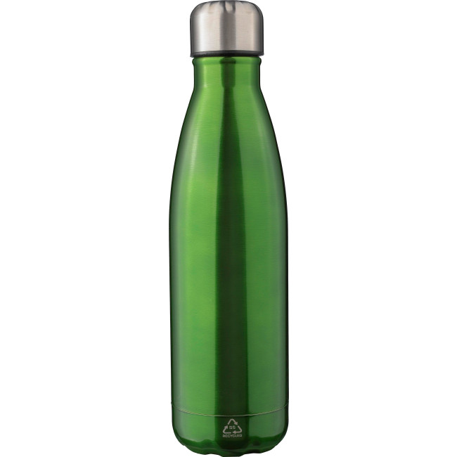 Borraccia in acciaio inox 304 riciclato (esterno acciaio inox 201), doppia parete, tappo a vite, include il logo “acciaio inox riciclato” inciso sulla borraccia, confezionata singolarmente in una scatola in cartone avana, capacità 500 ml