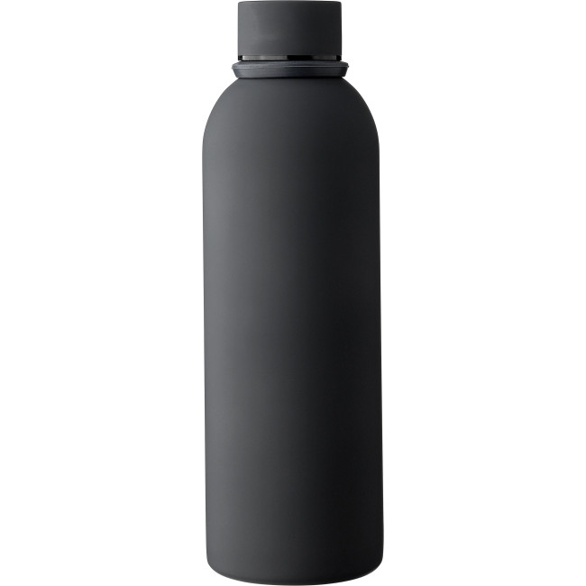 Borraccia in acciaio inox riciclato con isolamento sottovuoto a doppia parete. L'interno è realizzato in acciaio inox 304, mentre l'esterno in acciaio inox 201. Rifinita con un rivestimento gommato per una sensazione di morbidezza al tatto. Coperchio a vite in PP con dettagli in metallo e passante in silicone per il trasporto. La borraccia presenta il logo "acciaio inox riciclato" inciso, capacità 500 ml, confezionata singolarmente in una scatola in cartone avana.