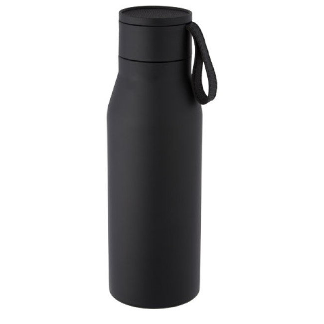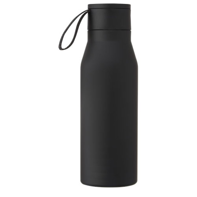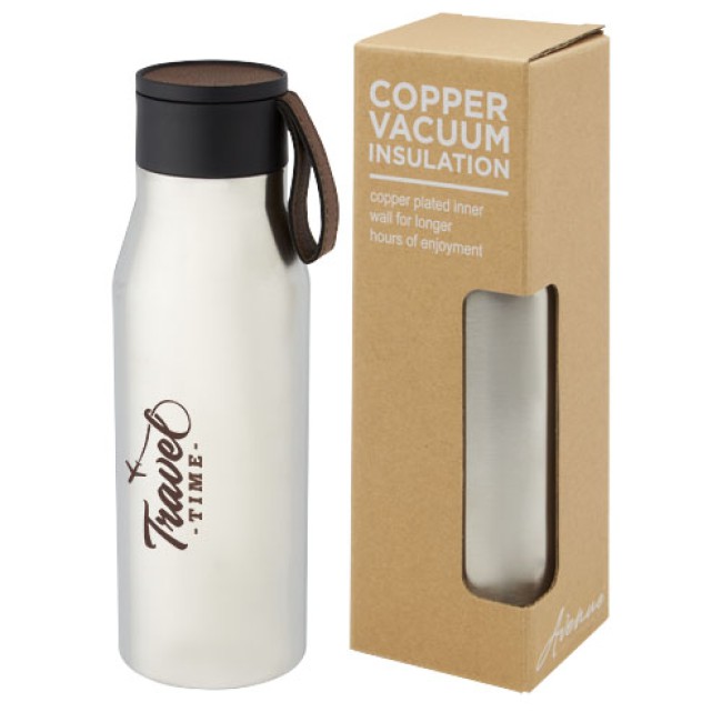 Borraccia termica in acciaio inox con isolamento sottovuoto in rame dal design classico ed elegante. Presenta un cinturino e dettagli sul tappo in finta pelle. Queste caratteristiche la rendono ideale per l'incisione laser, che metterà in evidenza il logo in argento creando un elegante effetto visivo. Grazie alla doppia parete in acciaio inossidabile 18/8 e in rame con isolamento sottovuoto, le bevande rimangono calde o fredde per diverse ore. Testata e approvata ai sensi della legislazione tedesca sulla sicurezza alimentare (LFGB) e testata per il contenuto di ftalati secondo il regolamento REACH. Capacità di 500 ml. Fornita in una confezione regalo in cartone riciclato.