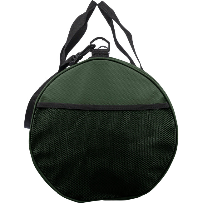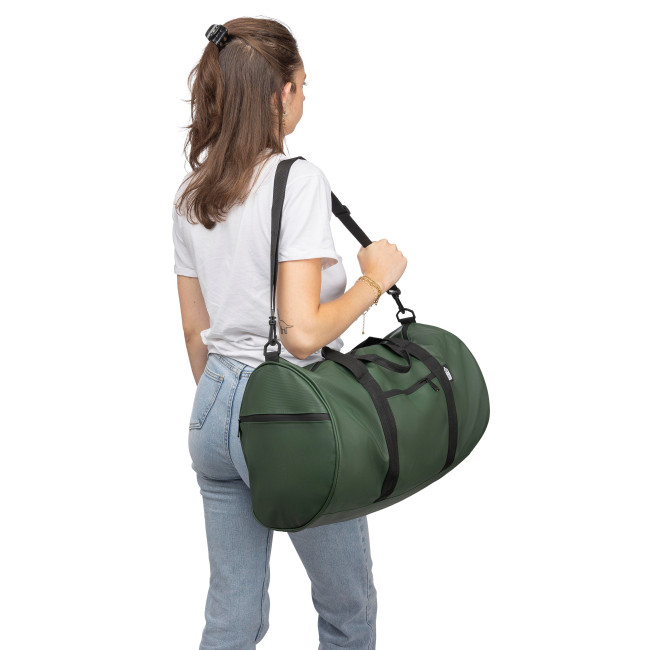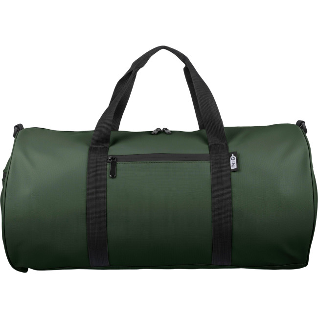 Borsa da viaggio rPET realizzata in poliestere 600D con fodera 210D e rivestimento in PU idrorepellente, dotata di ampio scomparto principale con zip, piccola tasca frontale con zip a scopo decorativo, ulteriore piccola tasca laterale con zip e tasca laterale in rete, dotata di due manici e tracolla regolabile, capacità 40 litri, con etichetta rPET esterna