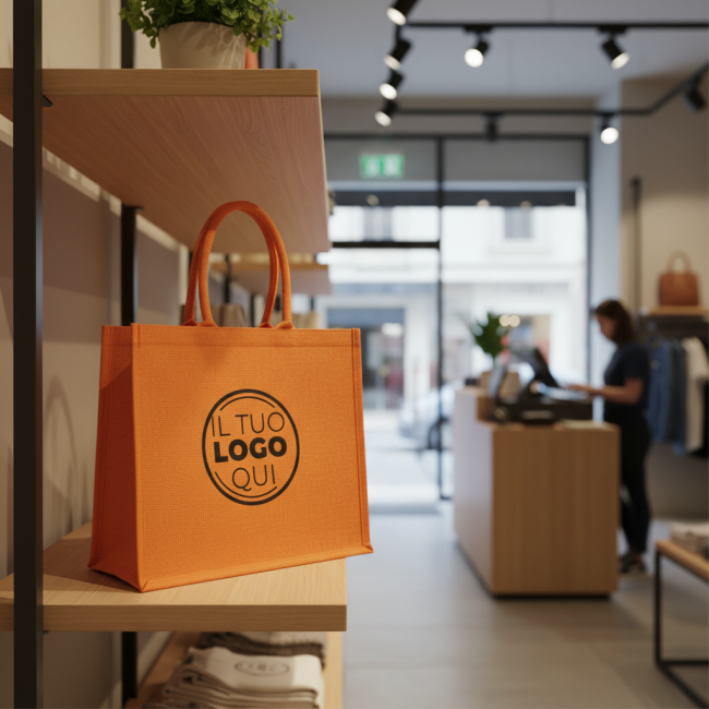 Borsa Ecoline realizzata in juta naturale laminata, dotata di doppi manici in cotone. Questa borsa è capiente e progettata per un uso sostenibile, ideale per trasportare oggetti. La sua struttura la rende facilmente personalizzabile.
