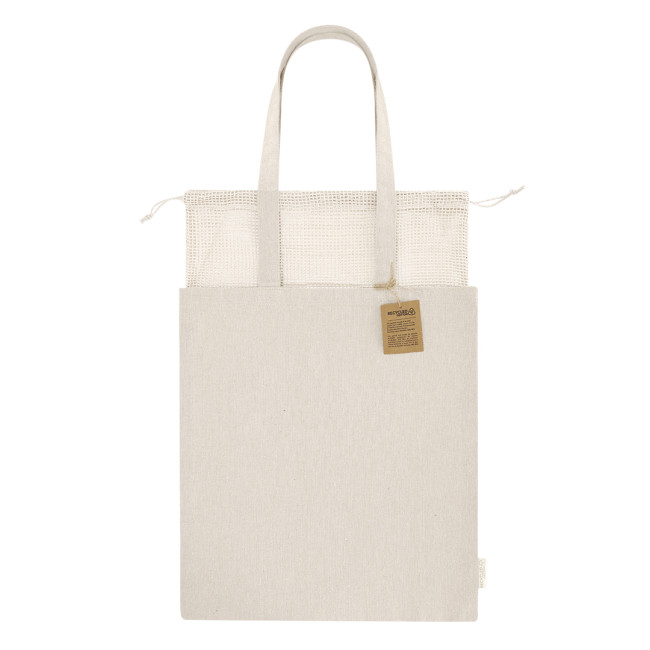 La borsa Flerix è realizzata in cotone riciclato di 260 g/m², con un sistema di chiusura superiore a cordoncini in rete. Le maniglie lunghe 70 cm sono rinforzate e la borsa ha una resistenza fino a 8 kg. Include un logo sull'etichetta laterale, rendendola una scelta ecologica e funzionale.