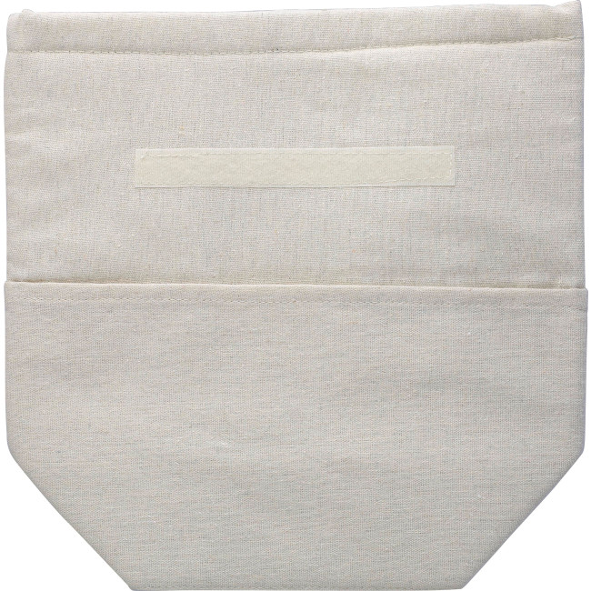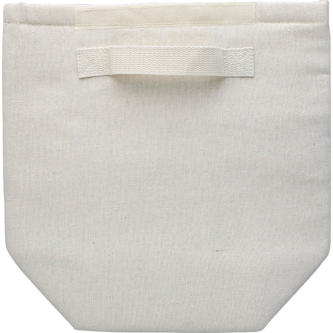 Borsa termica rolltop in cotone riciclato 220 g/m2, rivestimento interno in EPE da 3 mm e PEVA 12C, presenta chiusura in velcro, piccola tasca frontale, manico per il trasporto, include etichetta esterna cotone riciclato