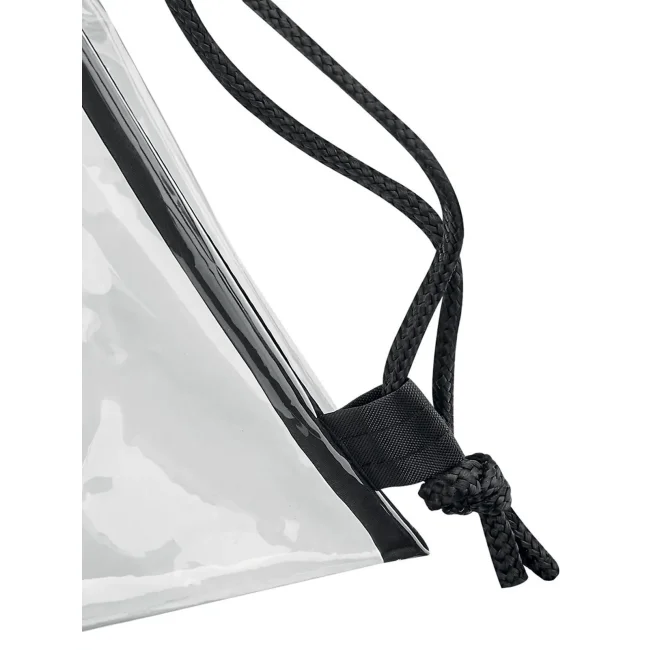 Borsa da palestra realizzata in TPU trasparente, caratterizzata da un tessuto soft-touch e rilegatura in poliestere. Con una capacità di 11 litri e dimensioni di 33x45 cm, è dotata di cordini rinforzati per una maggiore resistenza. L'area di stampa di 28x26 cm consente personalizzazioni efficaci.