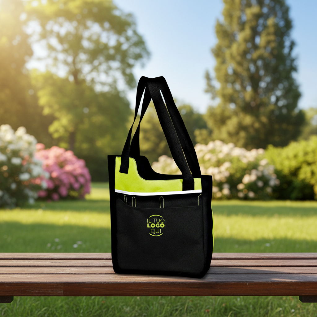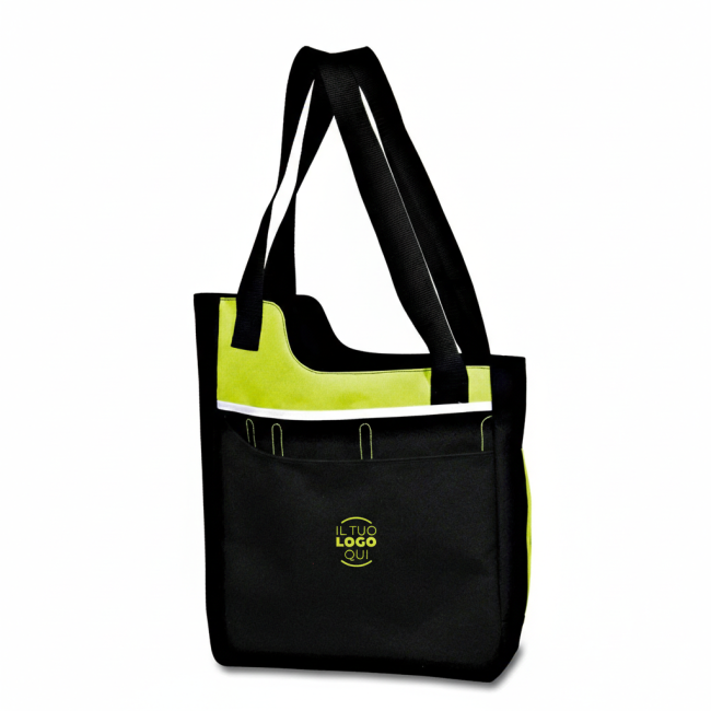 Borsa a tracolla caratterizzata da un design multitasche, con un'ampia tasca dotata di chiusura a velcro, portapenna e portabiglietti. Include una tasca laterale a rete per bottiglia e lunghi manici per un trasporto comodo. Confezionata in polybag.