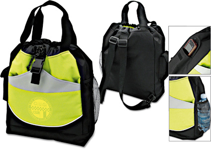Borsa a forma di zaino con ampia tasca principale e chiusura a cordoncino. Dotata di tasca frontale con passante portapenne e tasca laterale a rete per bottiglia. Include anche una taschina portacellulare o MP3. Confezione in polybag. Personalizzabile con logo.