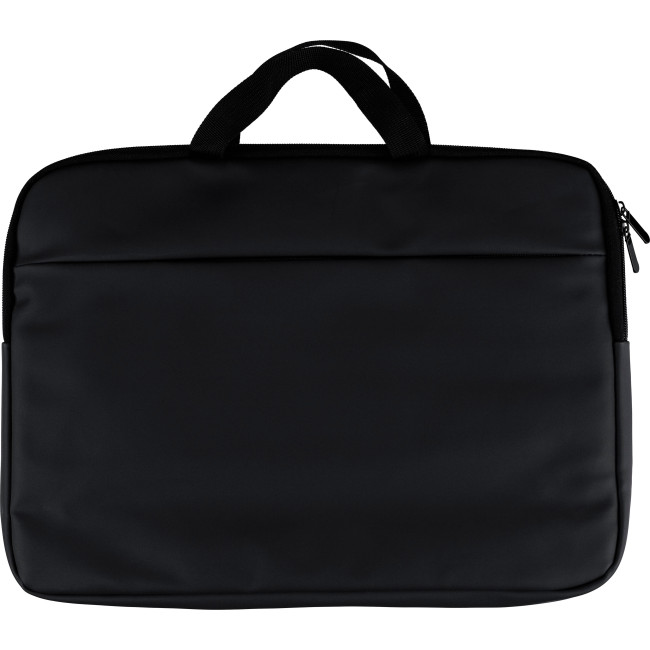 Borsa portacomputer in PU riciclato, adatta per laptop fino a 15 pollici, con imbottitura da 4?mm e fodera in poliestere 210 D riciclato, dotata di tasca frontale con cerniera, tasca posteriore con chiusura a velcro, due manici corti, tracolla regolabile ed etichetta materiale "riciclato" interna.