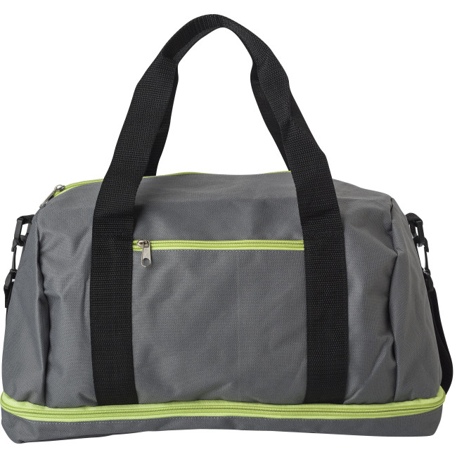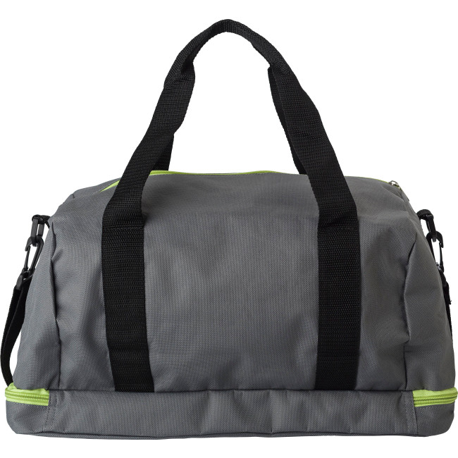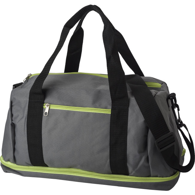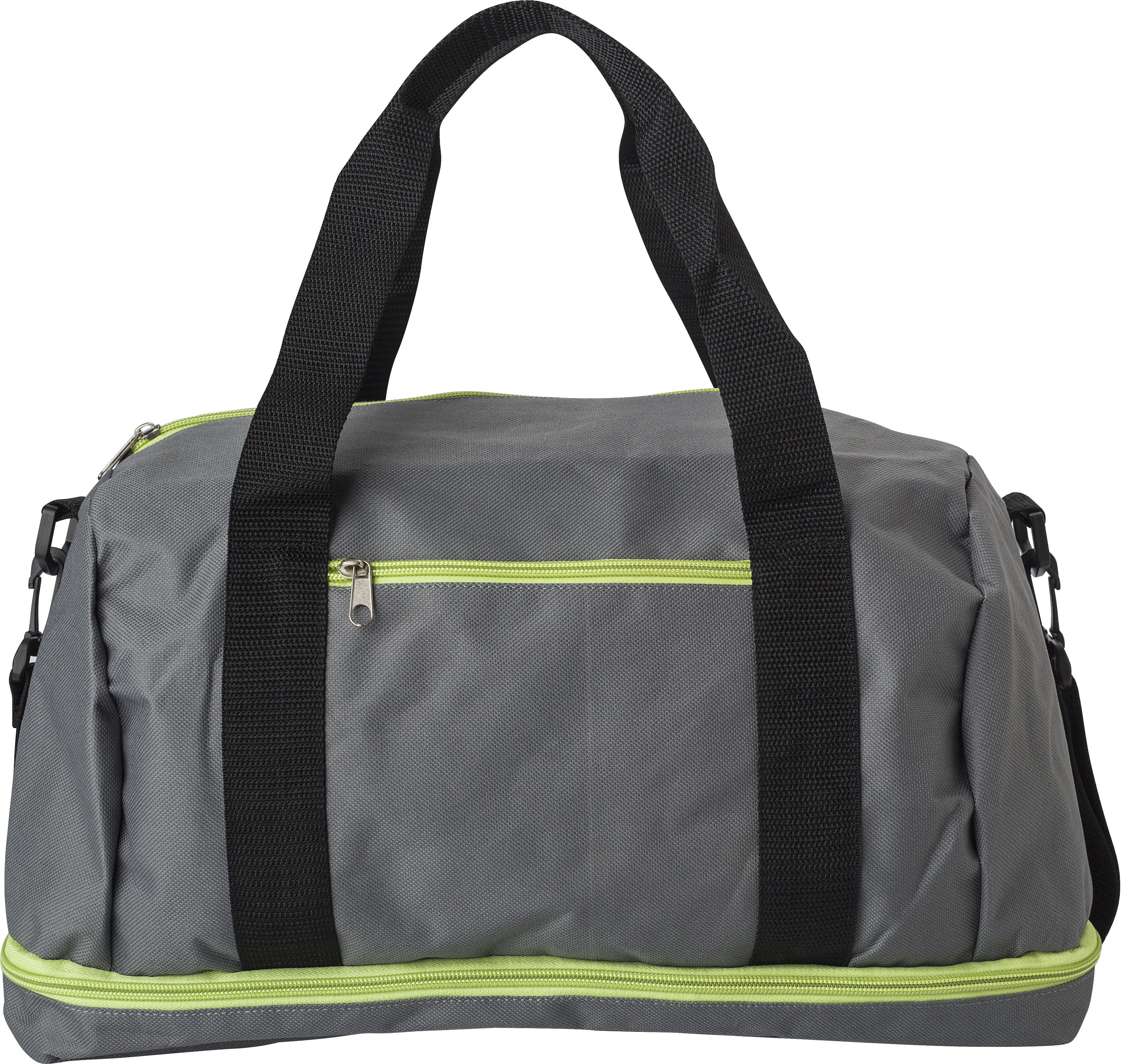 Borsa sportiva, vari scomparti di cui uno per le scarpe nella parte inferiore, chiusure a lampo colorate, manici e tracolla regolabili, in poliestere 600 D