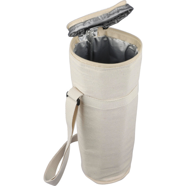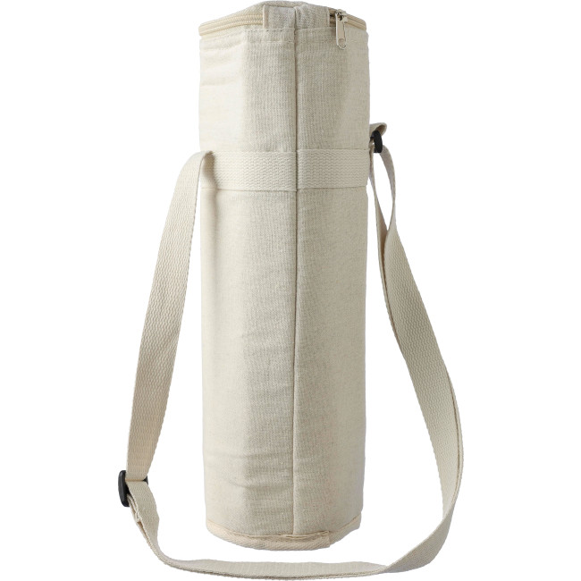 Borsa termica per bottiglie in cotone 270 g/m2 riciclato, rivestimento interno in EPE da 2 mm e PEVA 12C, chiusura lampo, lunga tracolla regolabile, capacità bottiglia da 1,5 litri, include etichetta esterna cotone riciclato