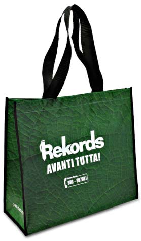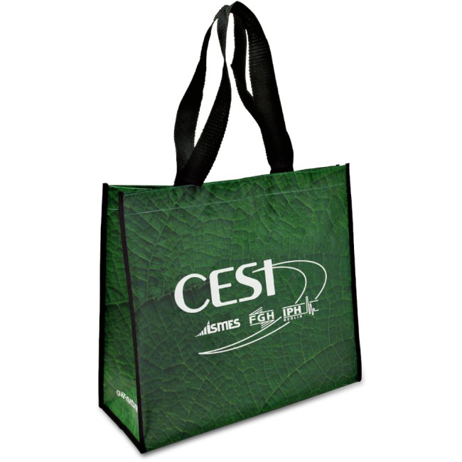 Borsa shopper in pet tessuto polietilene, ricavato da bottiglie riciclate. Robuste maniglie in nylon nero, misura manici 3x42.
