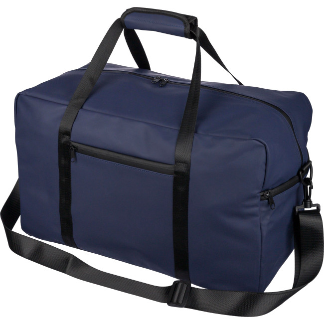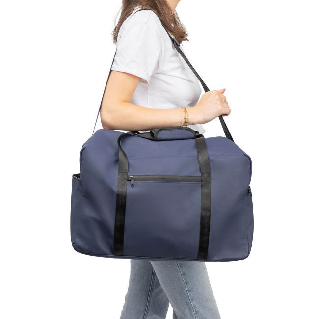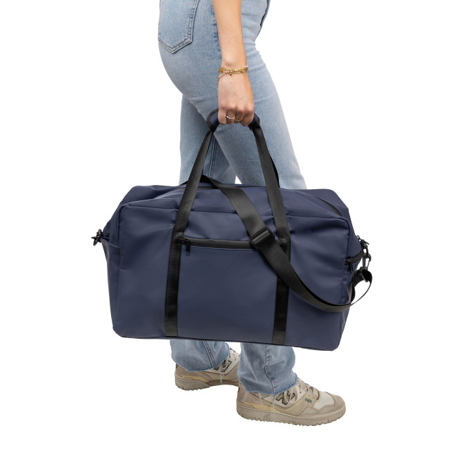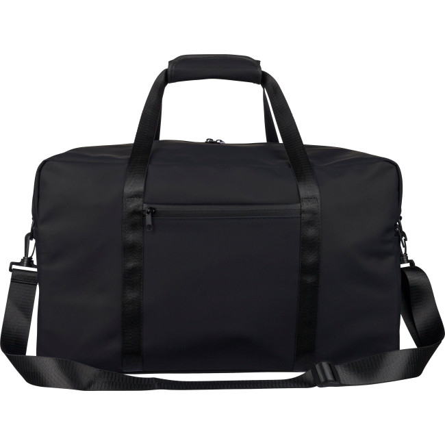 Borsone in PU riciclato, capacità 35?Litri, con fodera in poliestere 210 D riciclato, dotata di manici lunghi 2,5 × 108?cmper il trasporto, chiusura in velcro, tracolla regolabile 3,9?×?130?cm, piccola tasca frontale con chiusura lampo e ampio scomparto principale con cerniera, piccolo logo materiale "riciclato" all’interno dell’etichetta.