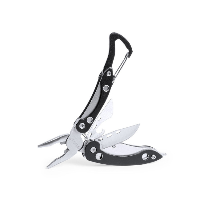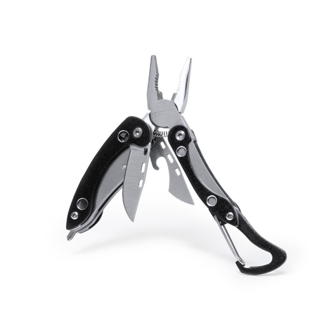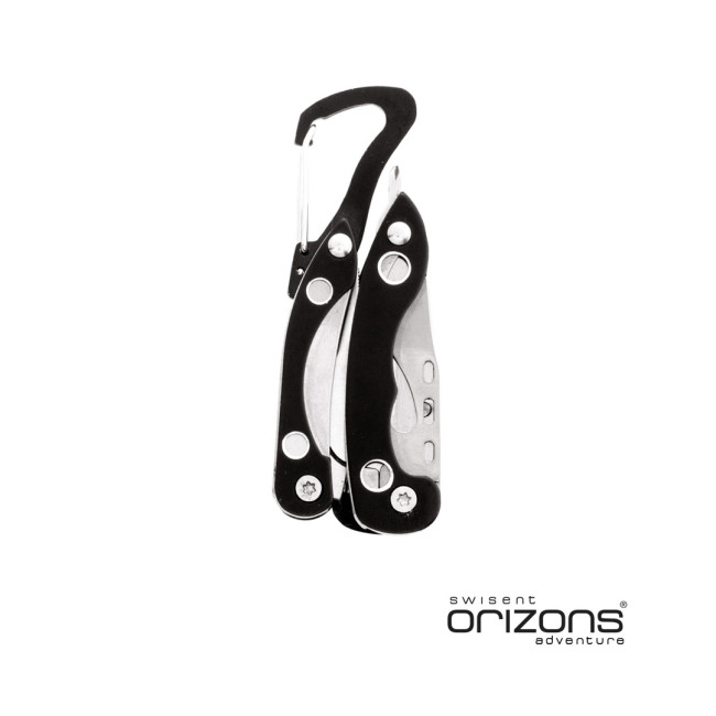 Multiutensile by Orizons con accessori in acciaio inox a 6 funzioni e manico in alluminio dai colori vivaci. Con pinze, coltellino, apriscatole, cacciavite a lama piatta con funzione di apribottiglie, cacciavite a croce e clip a moschettone. Presentato in una scatola dal design accattivante con logo del marchio.