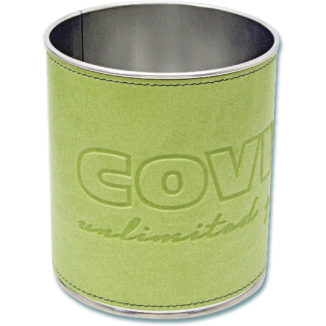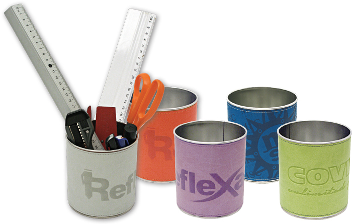 Bossolo portapenne in latta foderata di Vivella, disponibie in cinque combinazioni di colore.