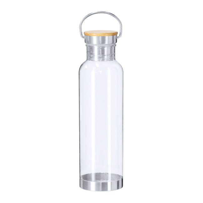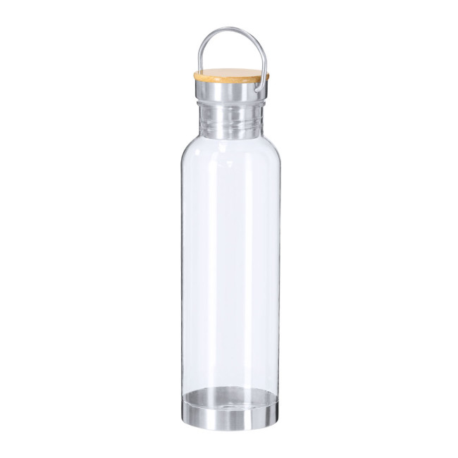Bottiglia RPET da 800 ml con corpo trasparente e coperchio in bambù. Realizzata in plastica riciclata, contribuisce alla sostenibilità ambientale. Dotata di un tappo a vite in acciaio inox e una base in acciaio, è un'ottima alternativa ecologica al legno tradizionale. Personalizzabile con logo aziendale.
