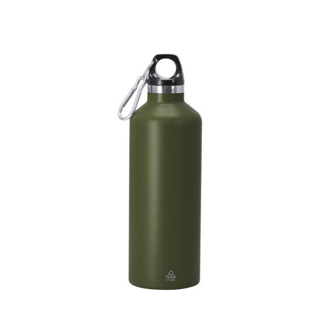 Bottiglia termica con capacità di 500 ml, realizzata in acciaio inox riciclato. Dotata di doppia parete per un'ottima conservazione della temperatura. Include un tappo a vite per una chiusura sicura e moschettoni metallici per un facile trasporto. Design elegante e sostenibile.