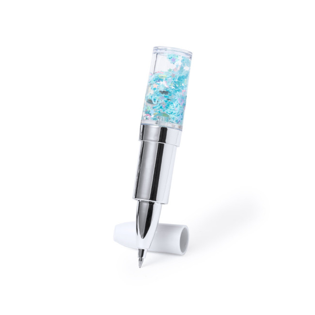 Originale penna a forma di rossetto, con liquido all'interno con un design colorato. Con cappuccio e inchiostro blu.