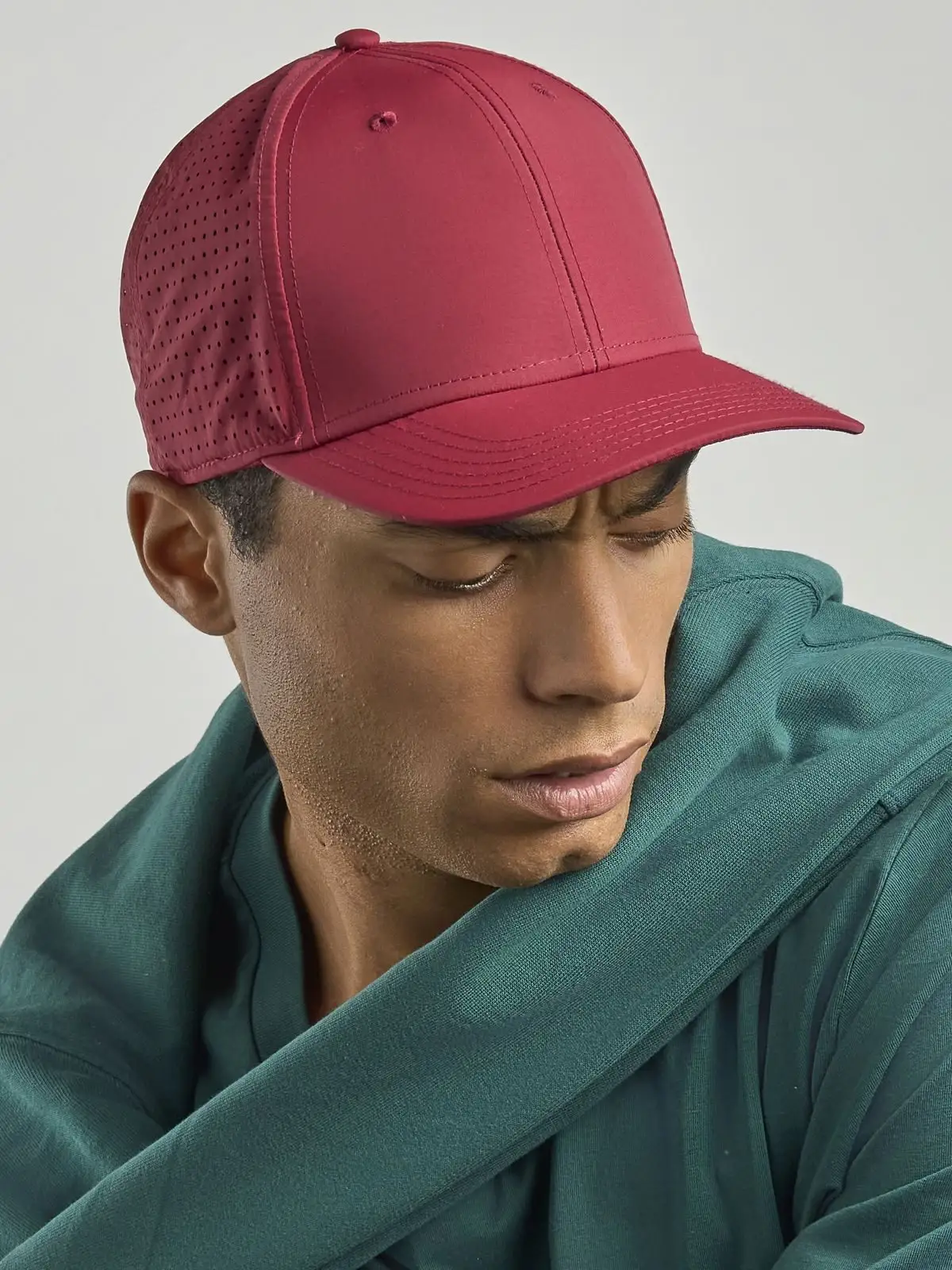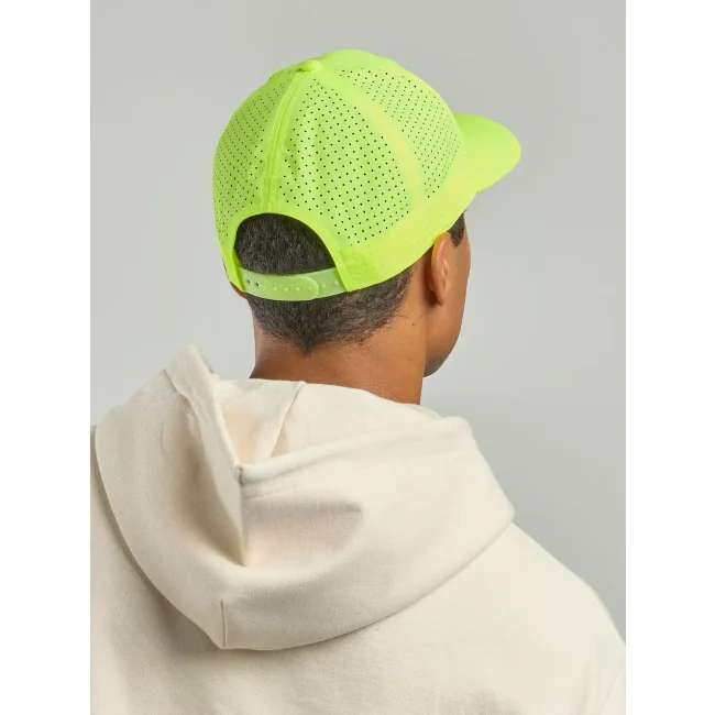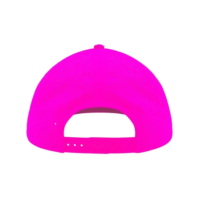 100% Nylon. Cappellino a 6 pannelli con corona traforata e fascia in tessuto 3D che lo rendono fresco e asciutto. Visiera precurvata, occhielli ricamati, 6 cuciture sulla visiera, chiusura in PVC, etichetta removibile.