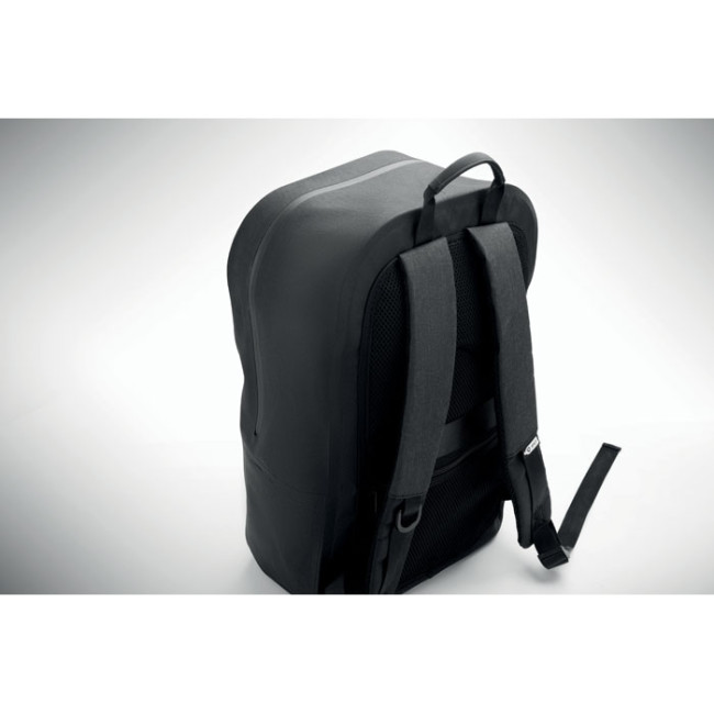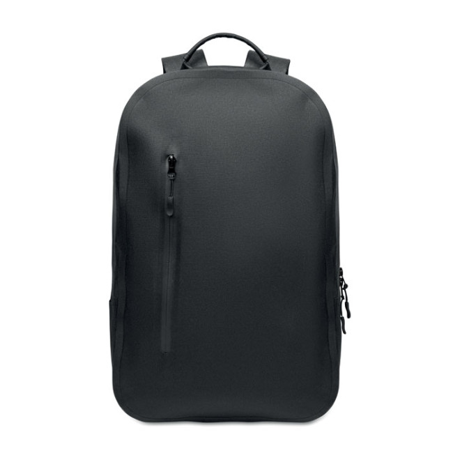Zaino per laptop 16'' in poliestere 300D RPET e fodera in poliestere 210D. Tessuto resistente all'acqua. Tasca nascosta con cerniera e porta trolley sul retro. Scomparto interno imbottito per laptop, schienale e tracolla in rete.