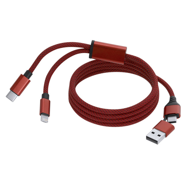 Cavo di ricarica con design magnetico per evitare grovigli, realizzato in resistente alluminio. Con doppia connessione di ingresso (Tipo C/USB) e uscite Tipo C e 2 in 1 (Lightning e Micro USB).
