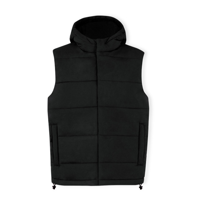 Gilet con cappuccio in caldo e morbido materiale 100% poliestere. In materiale leggero, resistente al vento e all'acqua. Elegante costruzione orizzontale e design trapuntato, con cappuccio fisso integrato. Doppia zip frontale e chiusura a gancio. Tasche laterali con linguette in tinta e coulisse regolabile sull'orlo. Disponibile nelle taglie XS, S, M, L, XL, XXL.