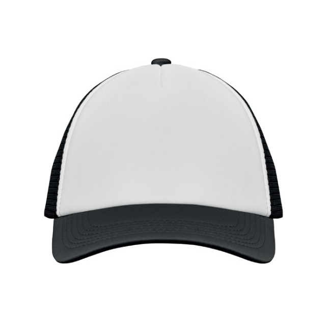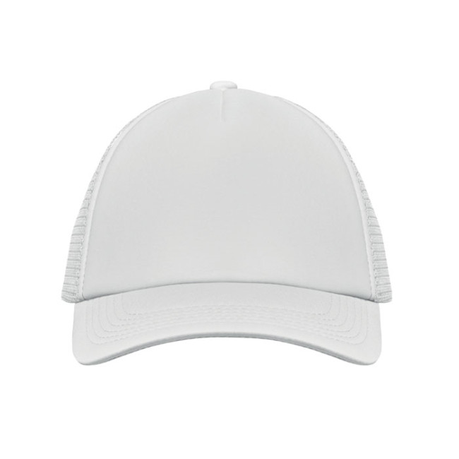 Cappello da camionista in poliestere 140-150 gr/m² (retro retinato, chiusura a strappo, 5 pannelli). Pannello frontale bianco, visiera colorata, altri pannelli retinati. Misura 7 1/4.