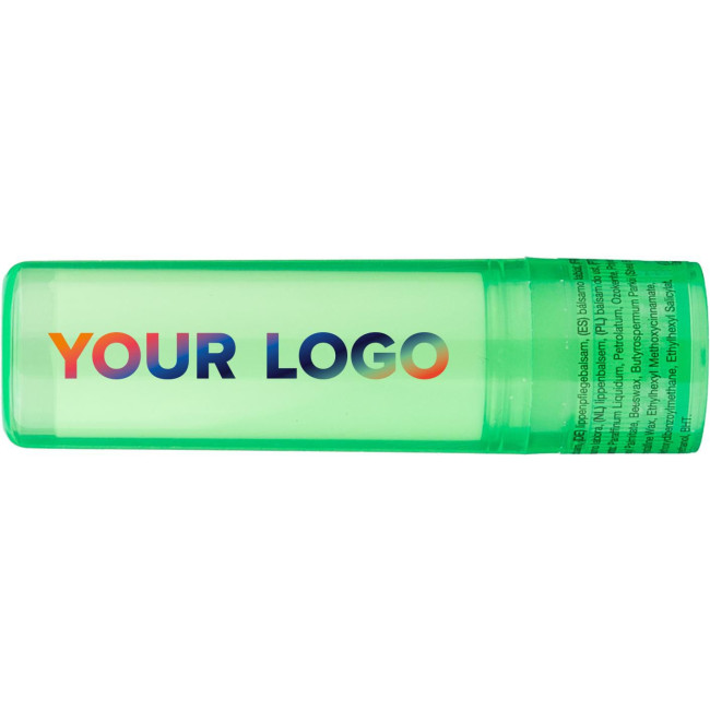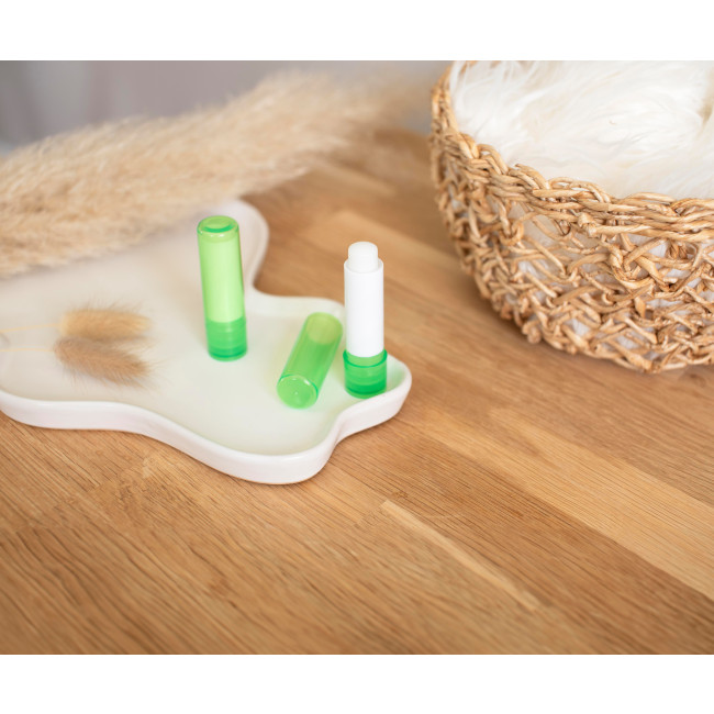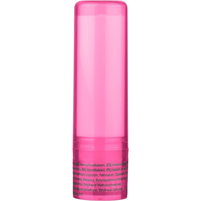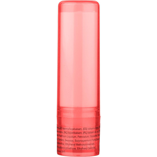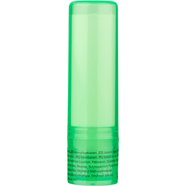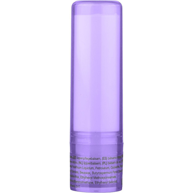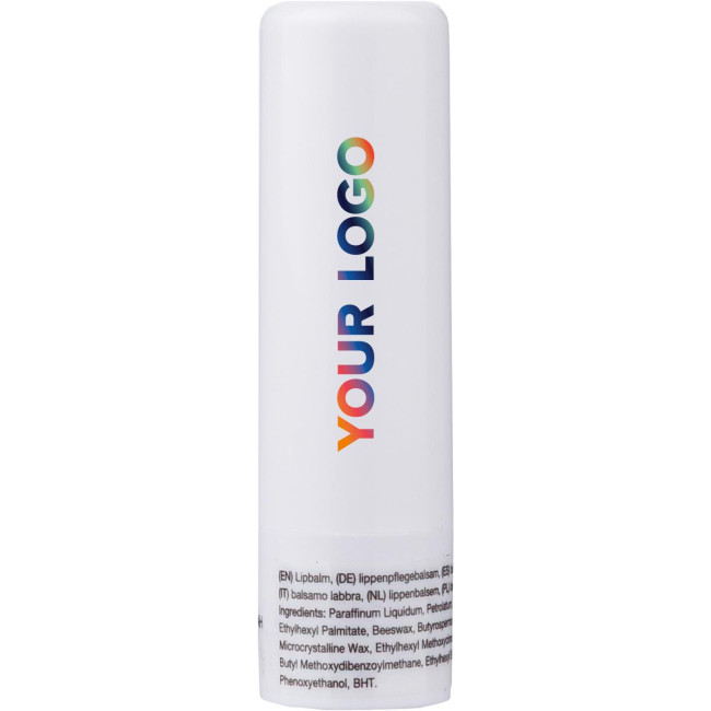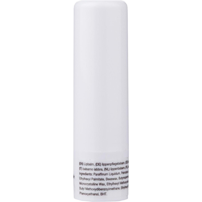 Balsamo labbra in ABS con protezione SPF 15, disponibile in un contenitore trasparente. I colori bianco, argento e nero presentano una finitura opaca, offrendo una soluzione pratica per la cura delle labbra.