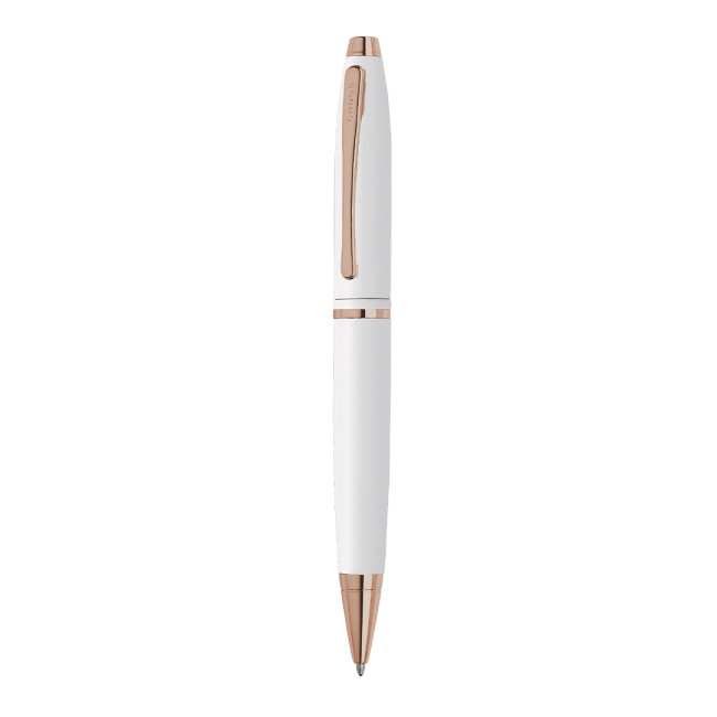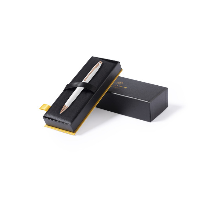 Penna a sfera con meccanismo retrattile, design bicolore distintivo in bianco con eleganti accenti in oro rosa. Corpo in metallo con finitura liscia e clip originale con logo. Presentata in un elegante astuccio nero singolo con il logo del marchio e interno morbido tipo camoscio abbinato. Inchiostro nero.