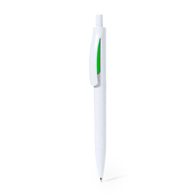 Penna con meccanismo a pulsante in ABS riciclato. Con finiture dai colori vivaci e fusto liscio e solido di colore bianco. Etichetta ABS riciclato sulla parte superiore della penna. In inchiostro blu.