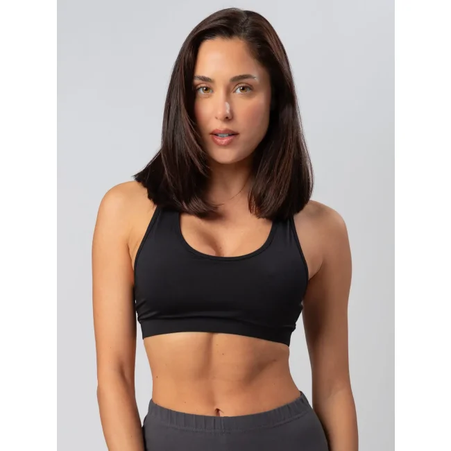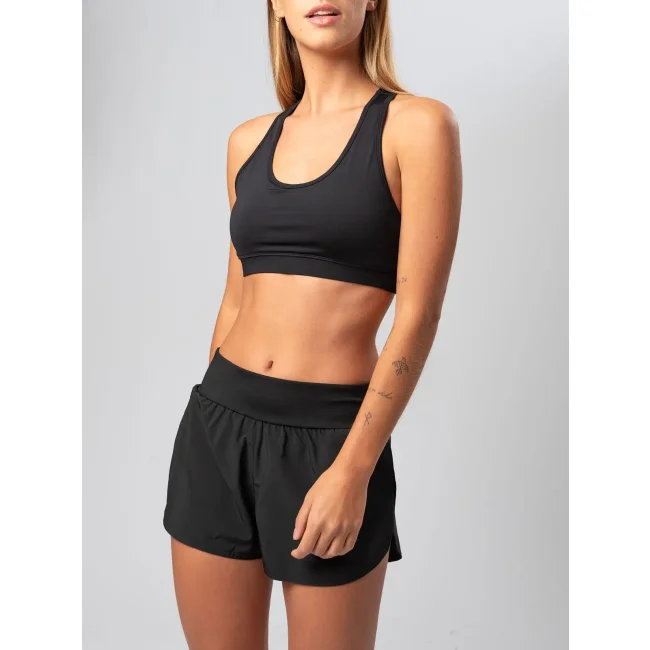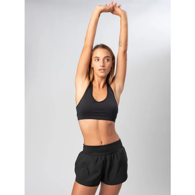 85% poliestere, 15% elastane. Top elasticizzato, girocollo e giromanica bordati, con fascia elastica, cuciture laterali. Etichetta strappabile.
