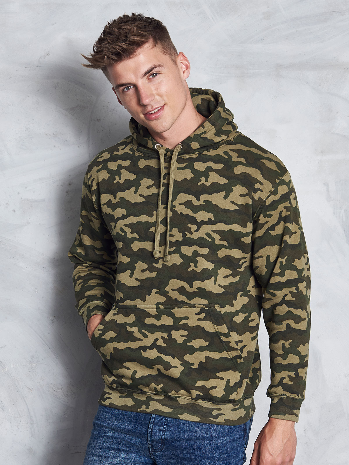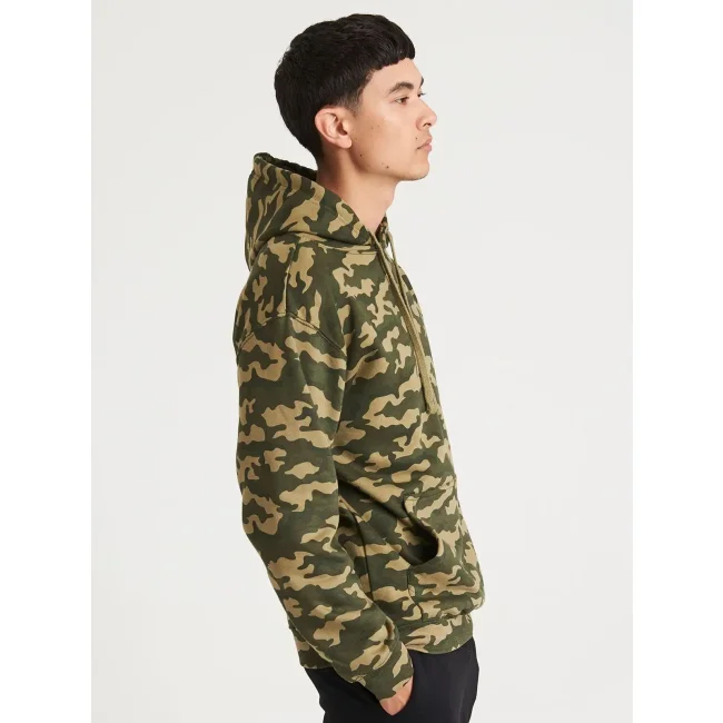80% cotone ring spun, 20% poliestere. Felpa con maniche set in, cuciture doppie, cappuccio a doppio strato regolabile con cordoncino piatto, tasca a marsupio, polsini a coste, superficie ideale per la stampa, etichetta strappabile, struttura con cuciture laterali.